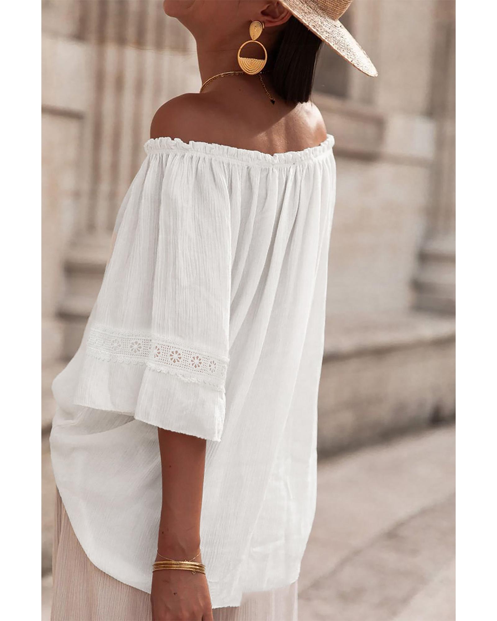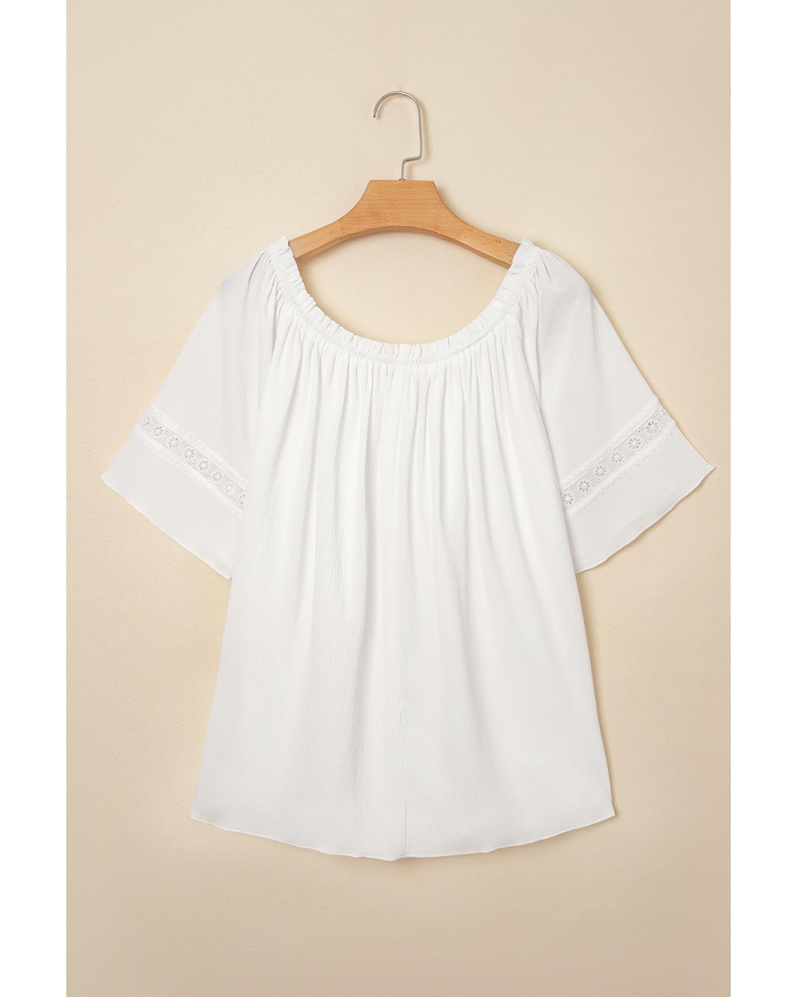 White Frilly Off Shoulder Lace Insert Sleeve Textured Blouse – XL