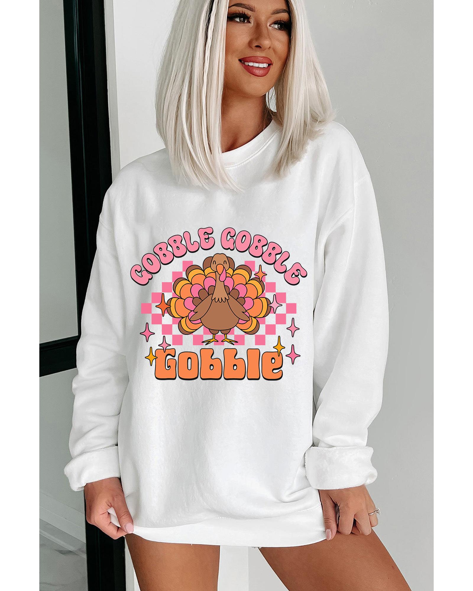White Gobble Gobble Turkey Graphic Crewneck Thanksgiving Sweatshirt – S