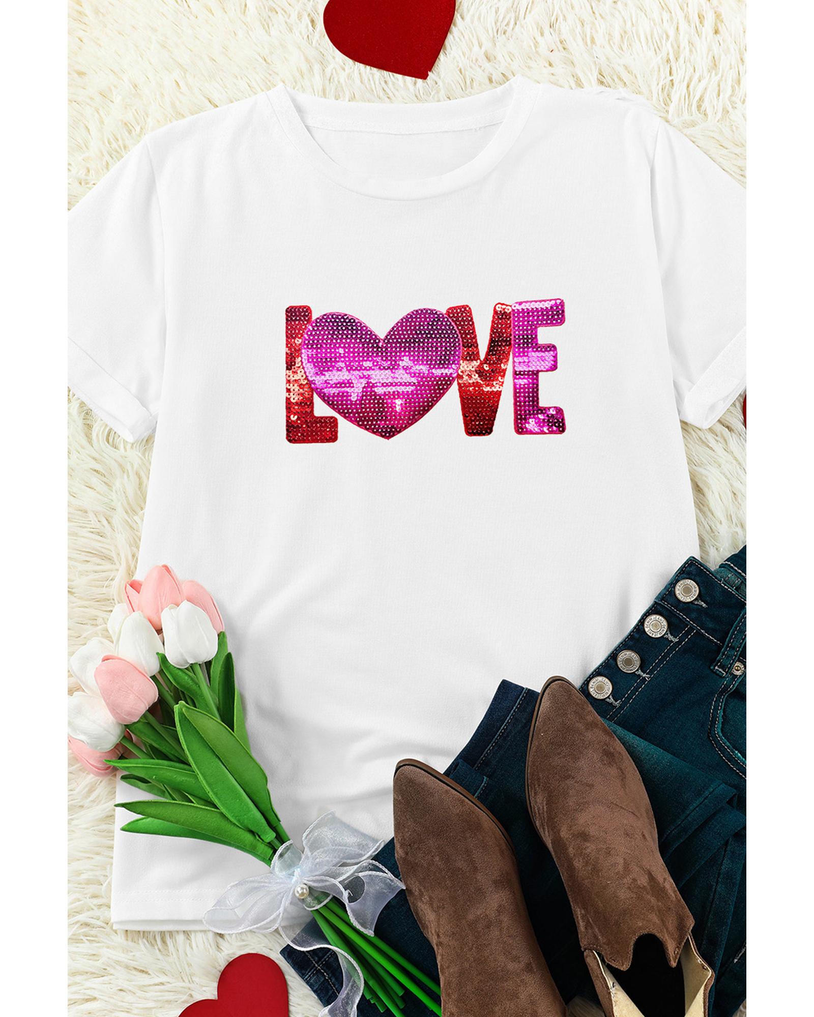 White Heart LOVE Patched Pattern Crewneck Valentines T Shirt – 3XL