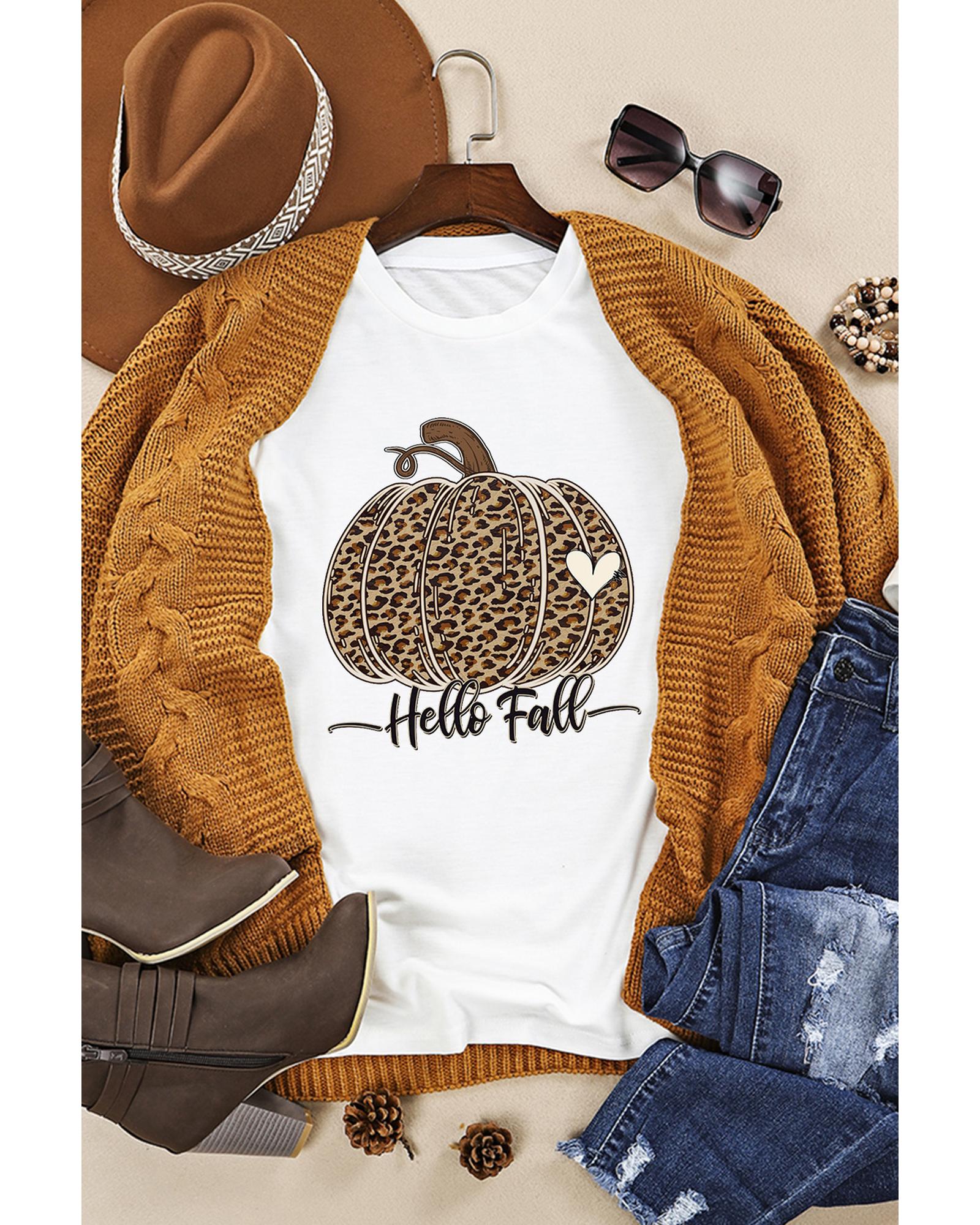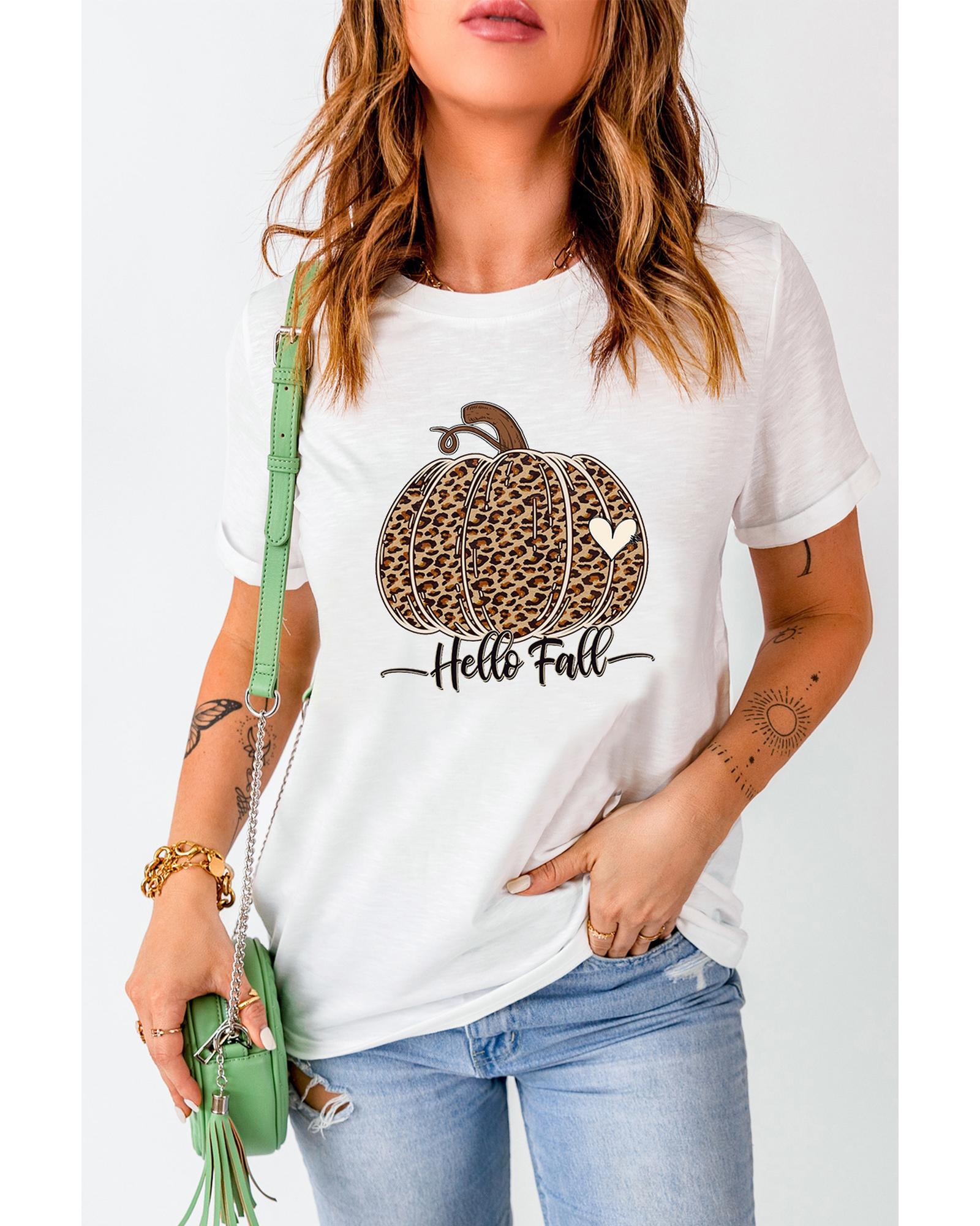 White Hello Fall Leopard Pumpkin Graphic T Shirt – XL