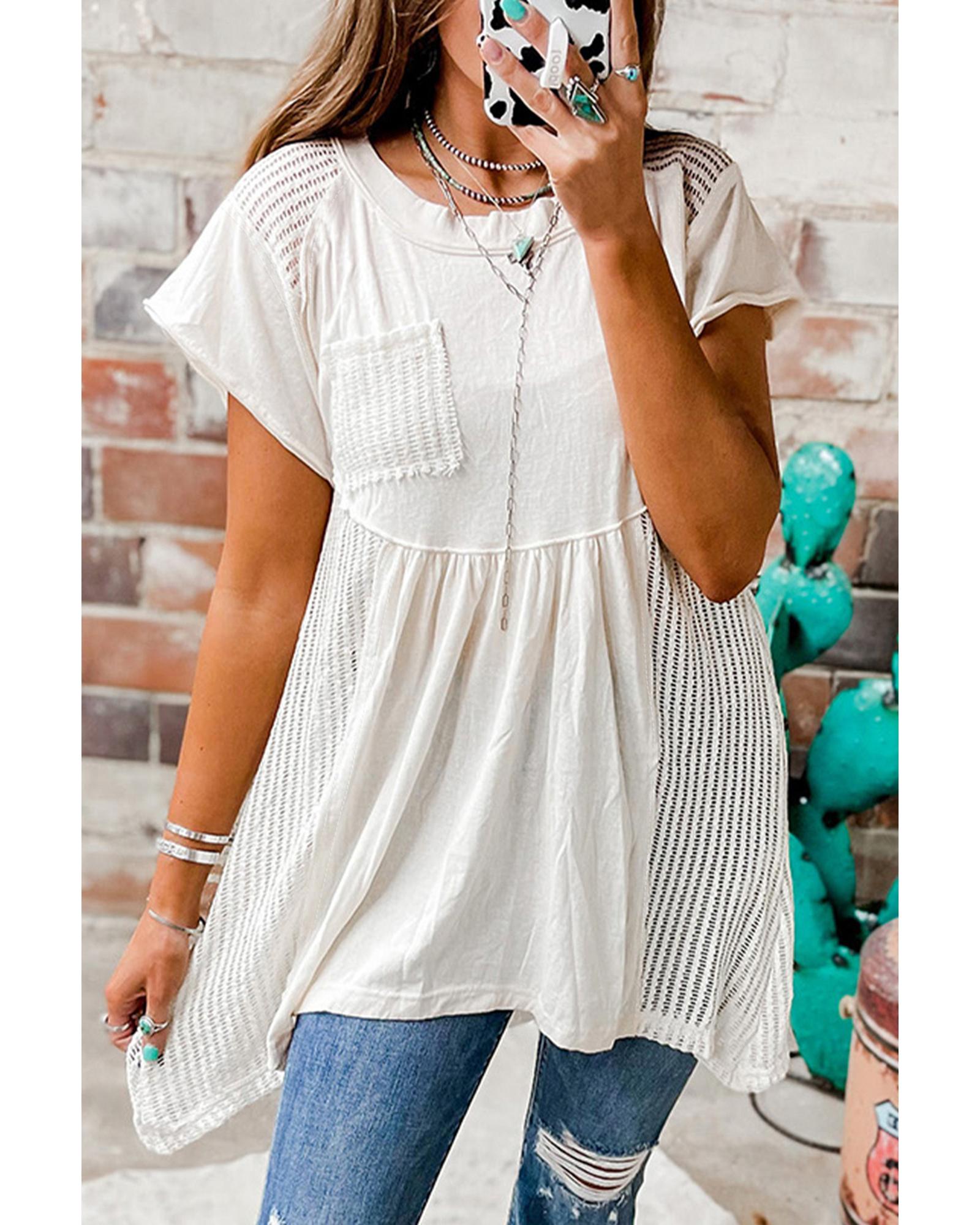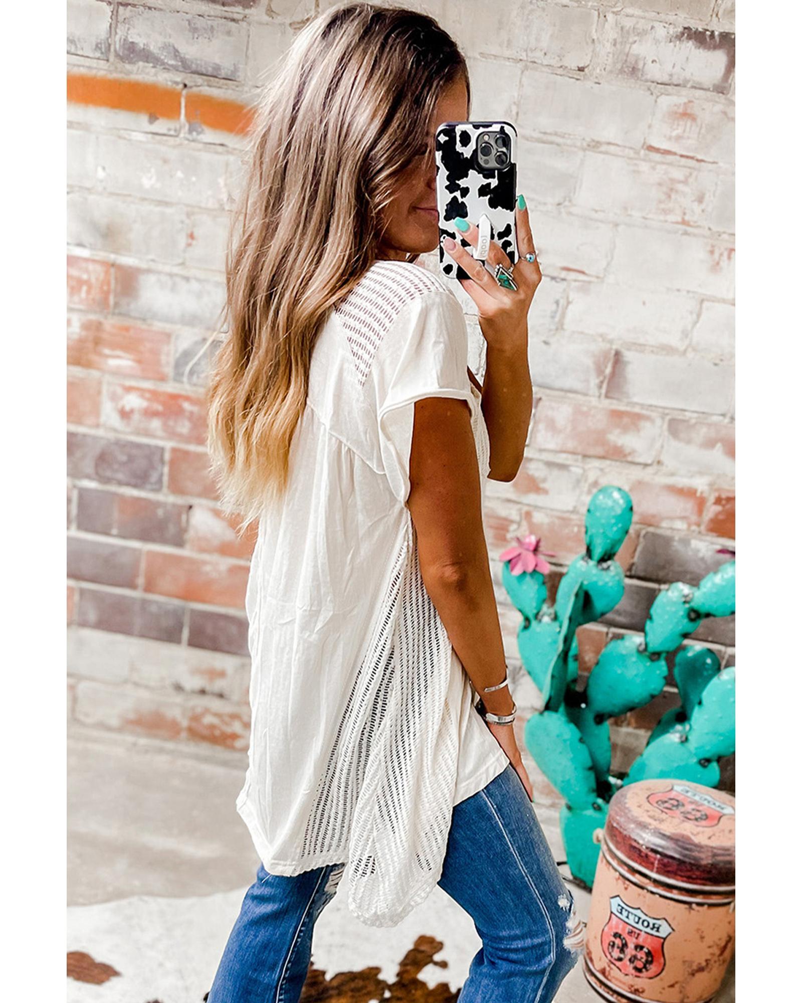 - White Hollow Knit Splicing Keyhole Back Tunic Top