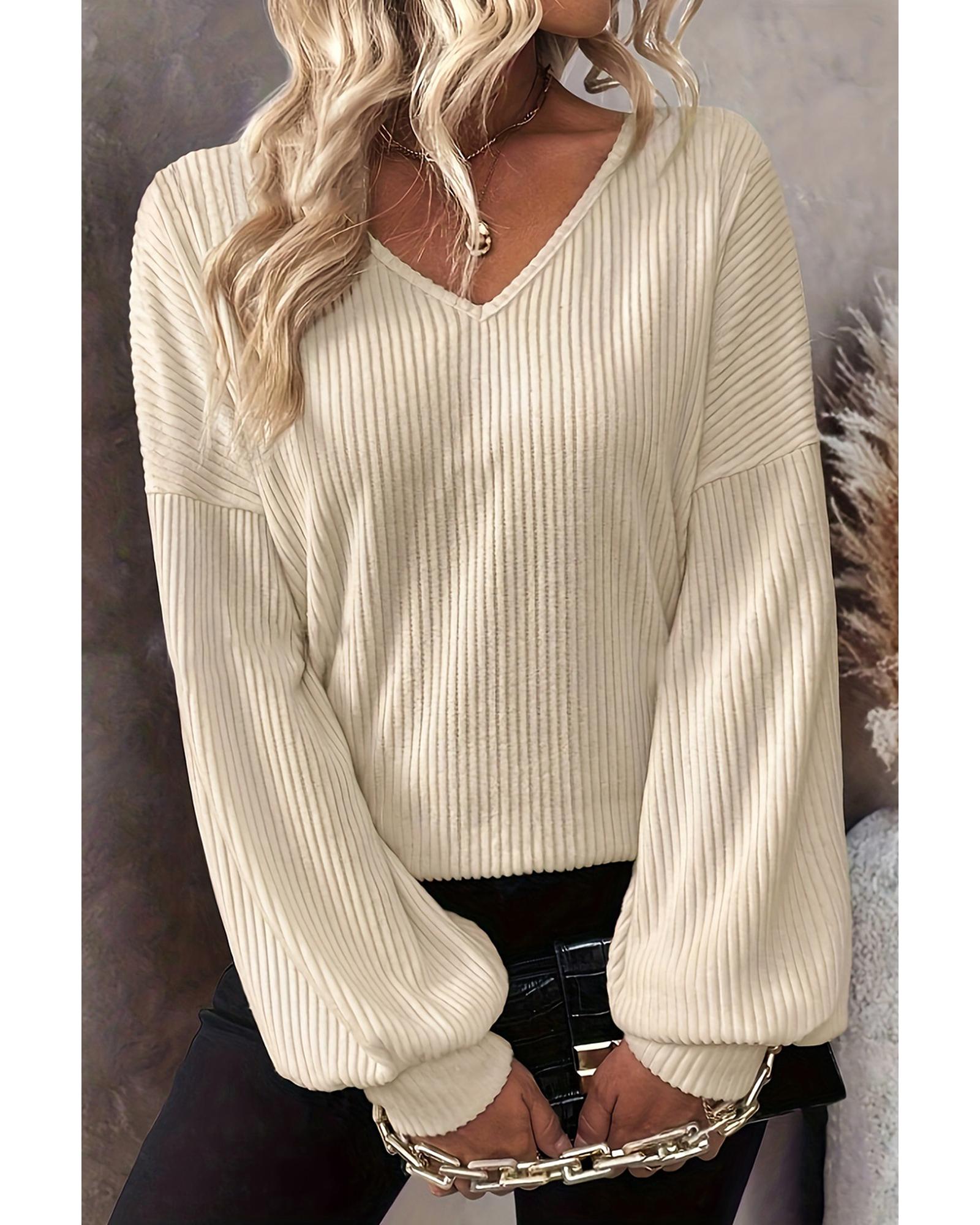 White Knot Back Drop Shoulder Ribbed Long Sleeve Blouse – M