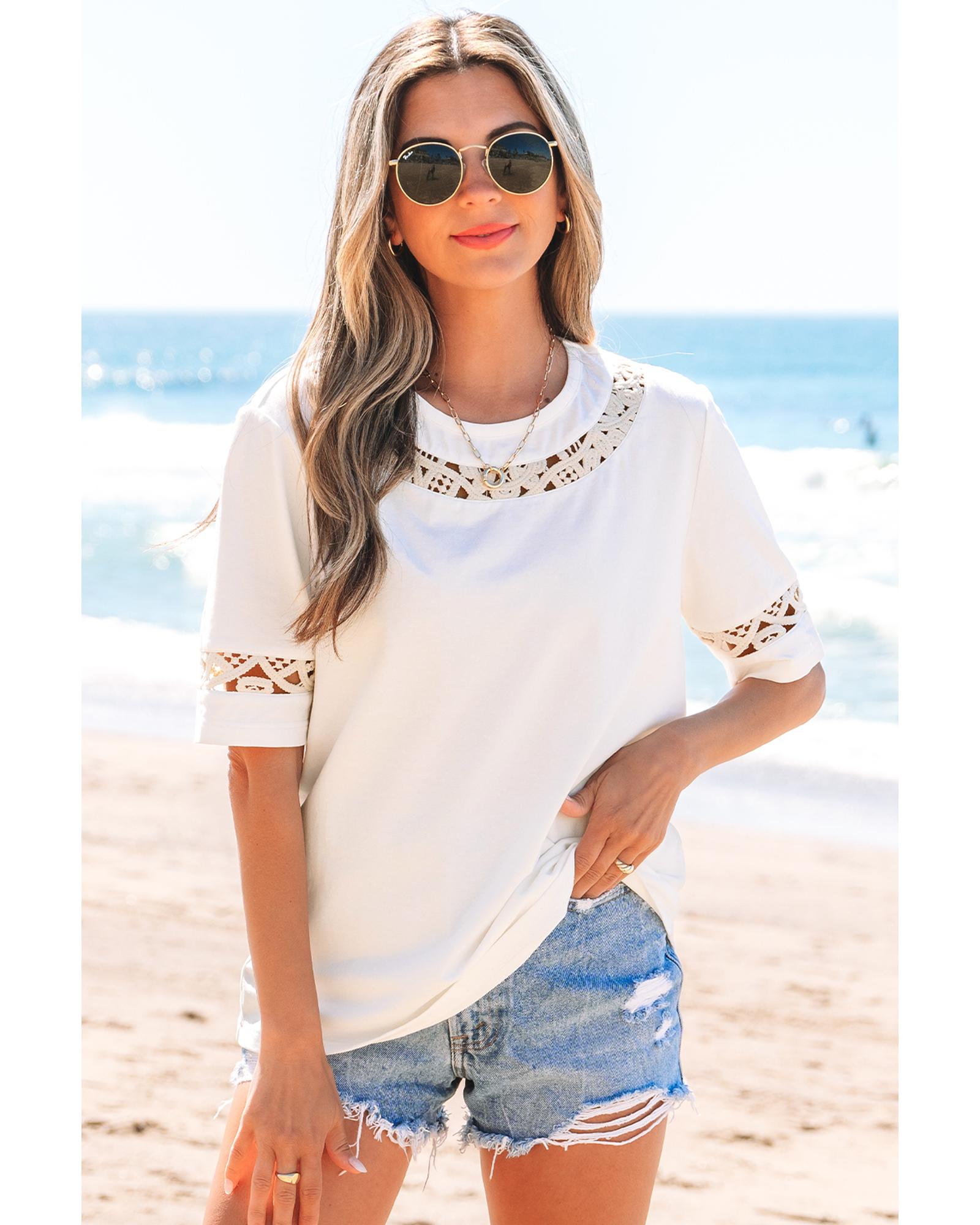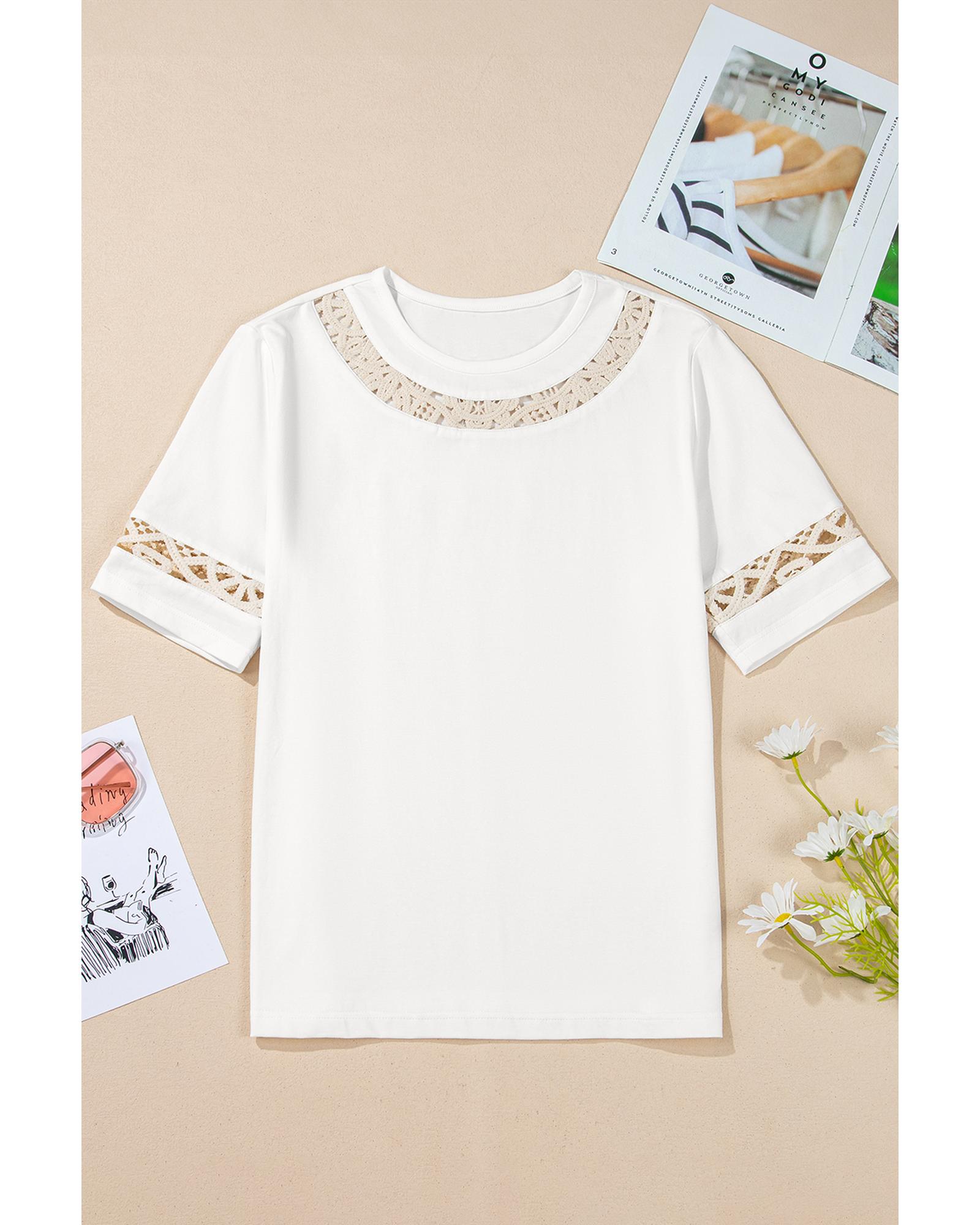 White Lace Crochet Crew Neck Casual T Shirt – M