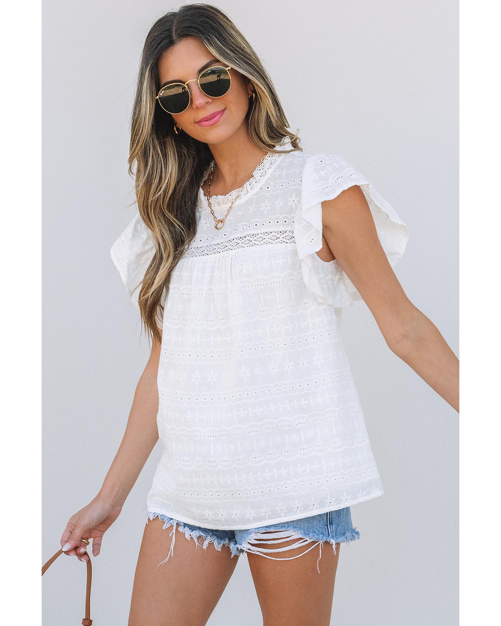 White Lace Neckline Flutter Sleeve Eyelets Blouse – L