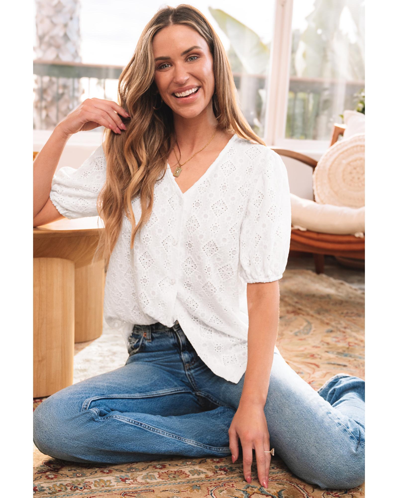 White Lace Puff Sleeve V Neck Button Up Shirt – S