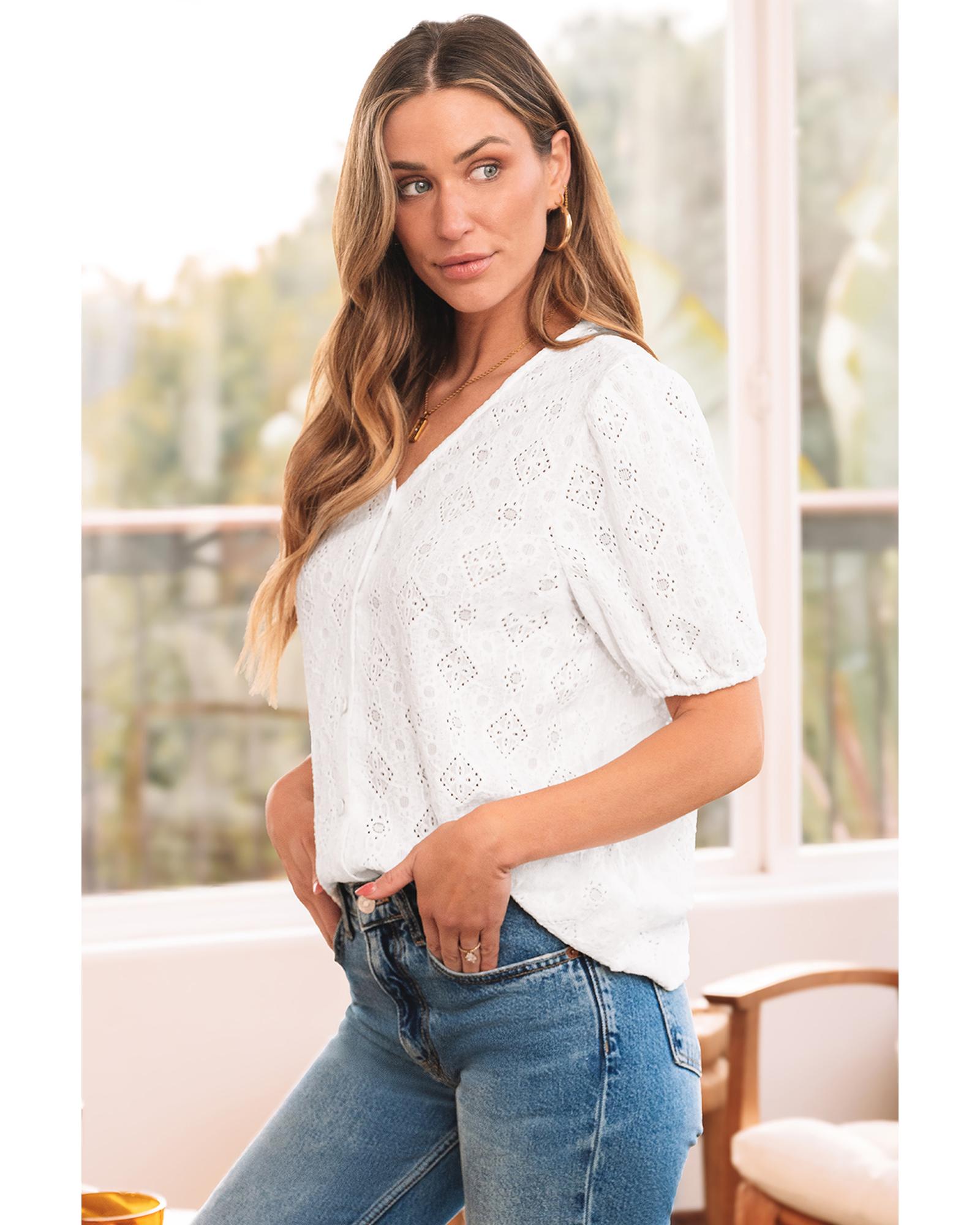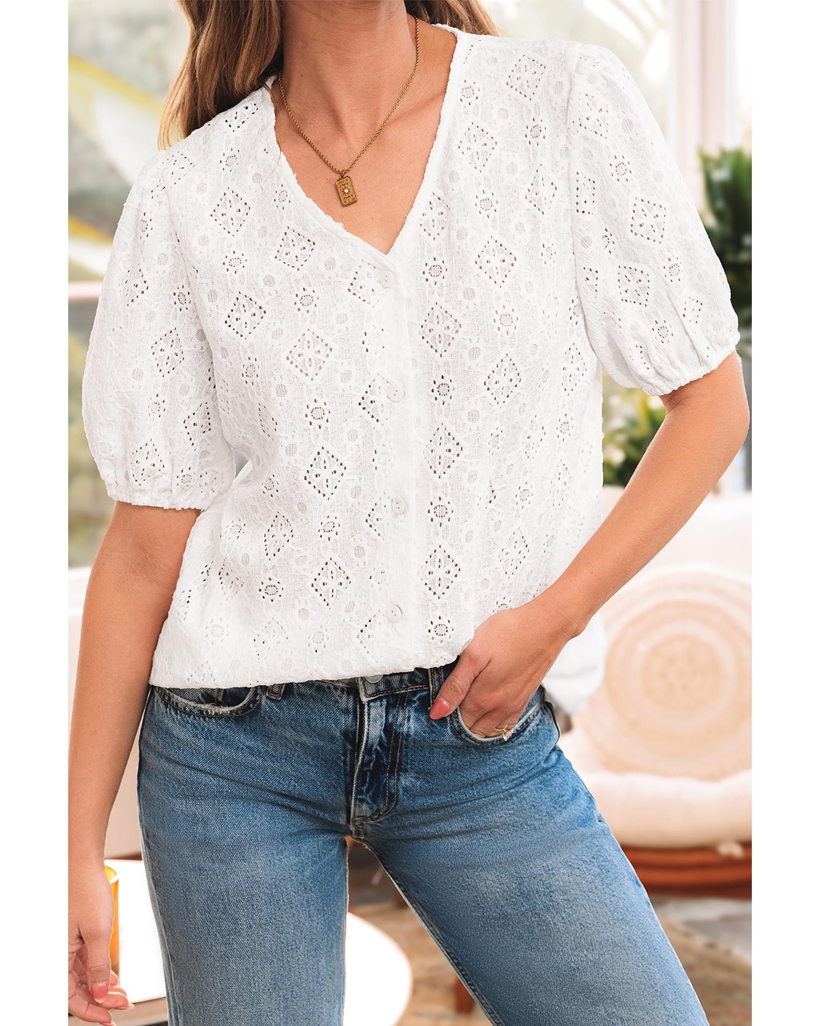 White Lace Puff Sleeve V Neck Button Up Shirt – XL