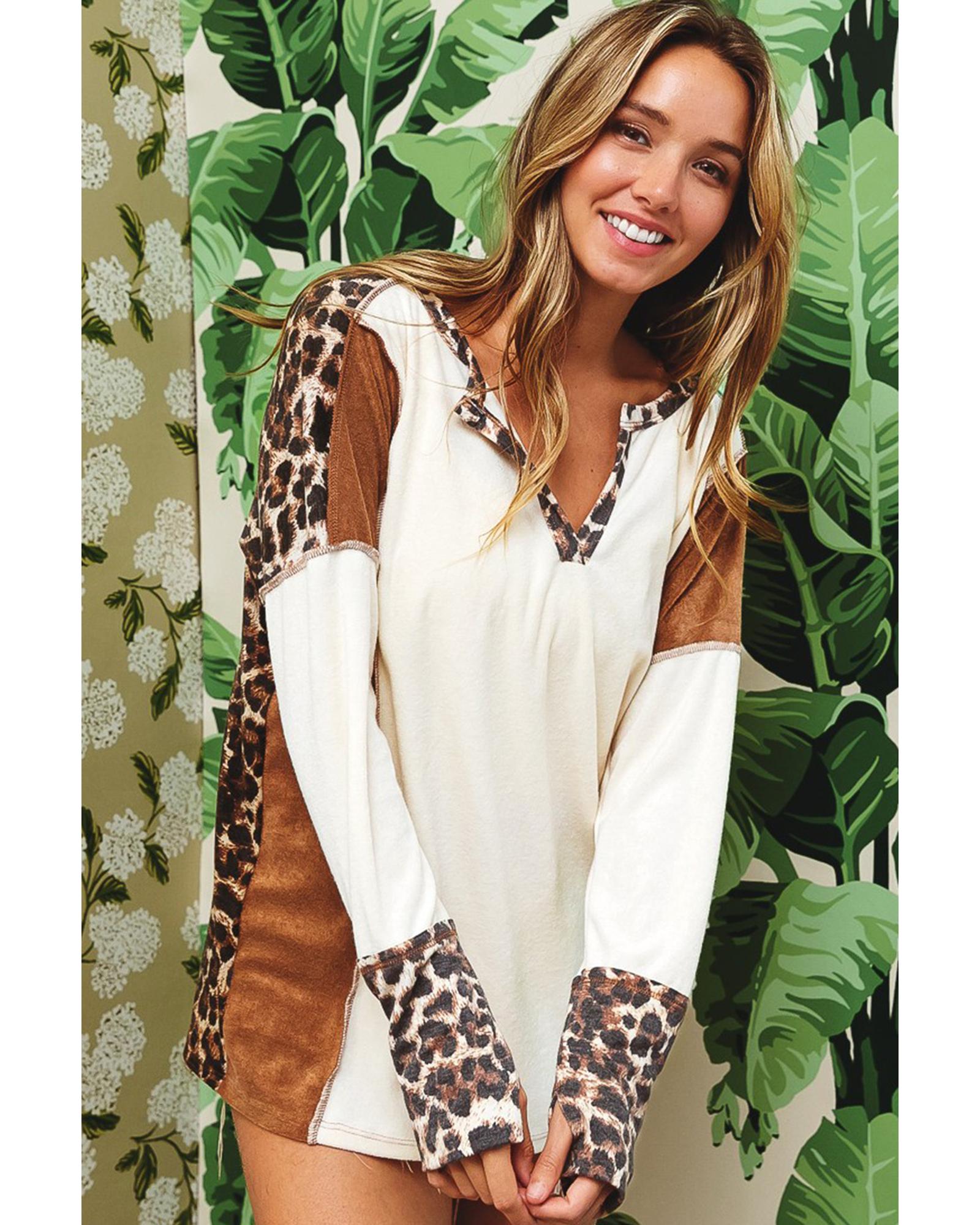 White Leopard Color Block Patchwork Split Neck Long Sleeve Top – M