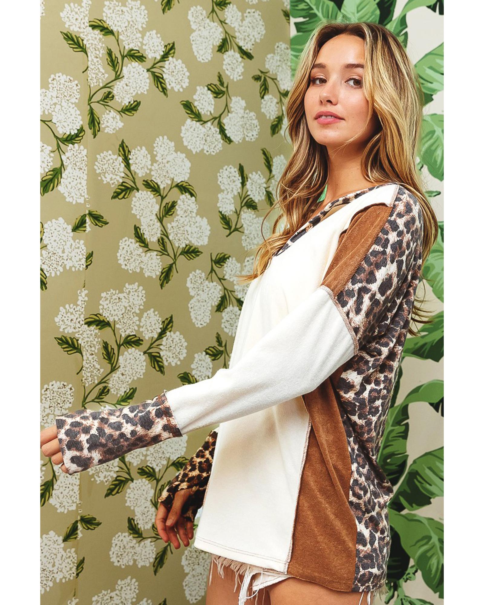 White Leopard Color Block Patchwork Split Neck Long Sleeve Top – S