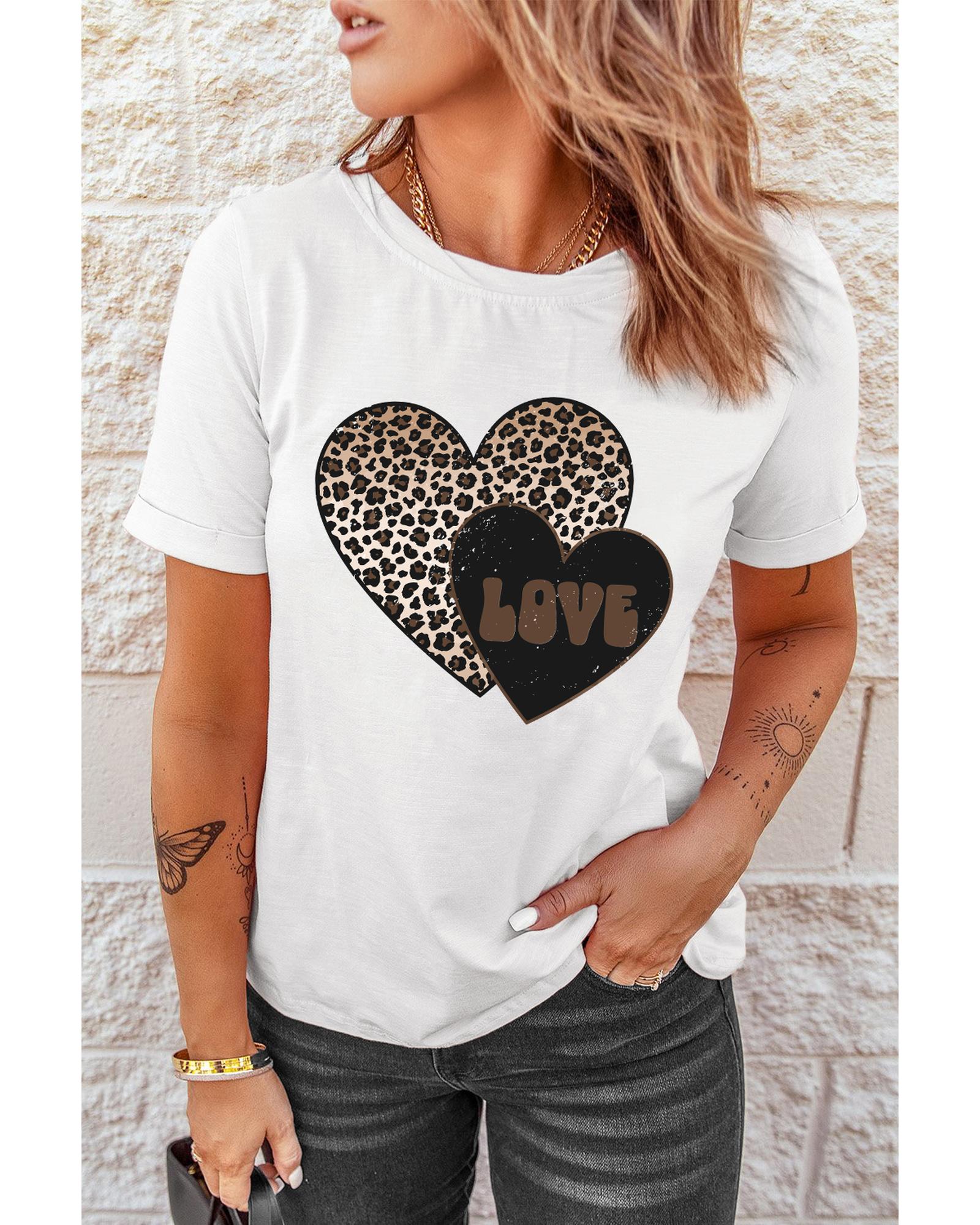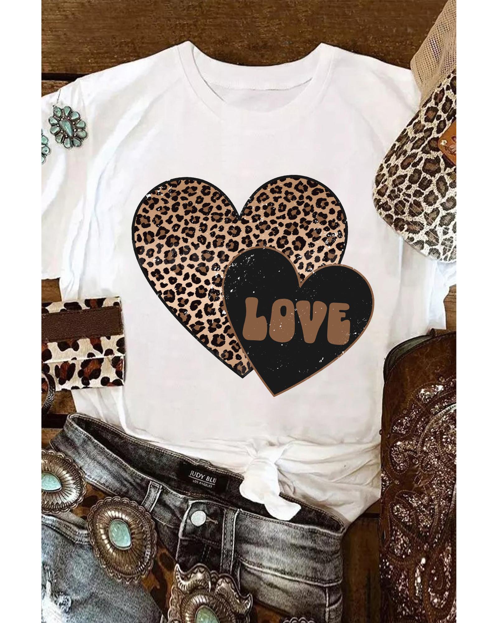 - White Leopard LOVE Double Heart Printed Valentines Graphic Tee