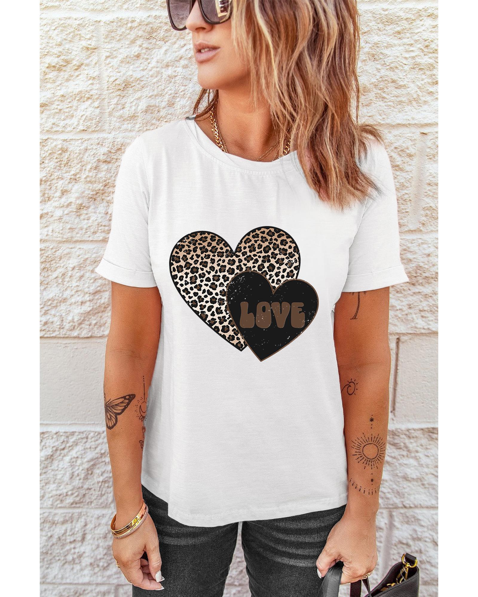 - White Leopard LOVE Double Heart Printed Valentines Graphic Tee