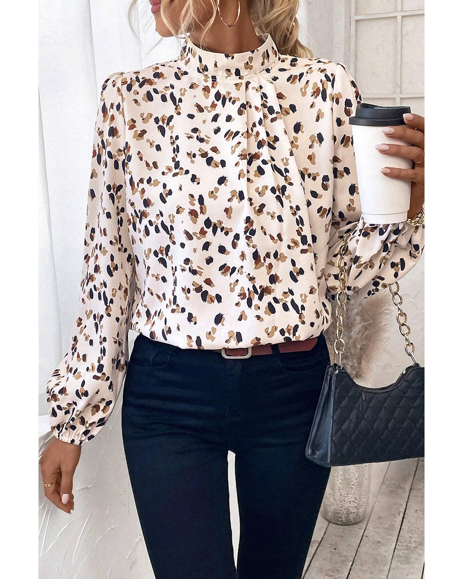 White Leopard Print Lantern Sleeve Mock Neck Pleated Blouse – M