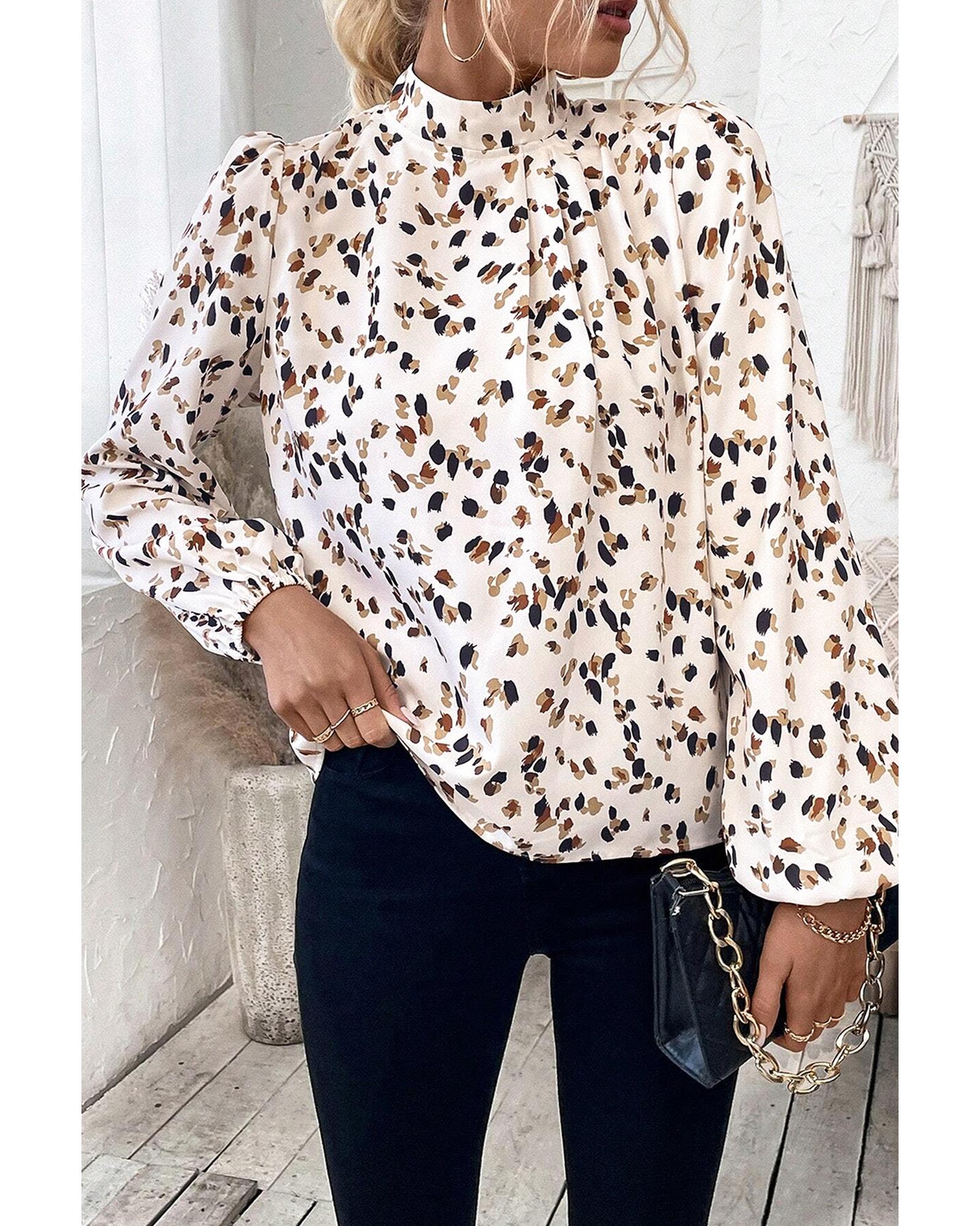 White Leopard Print Lantern Sleeve Mock Neck Pleated Blouse – XL