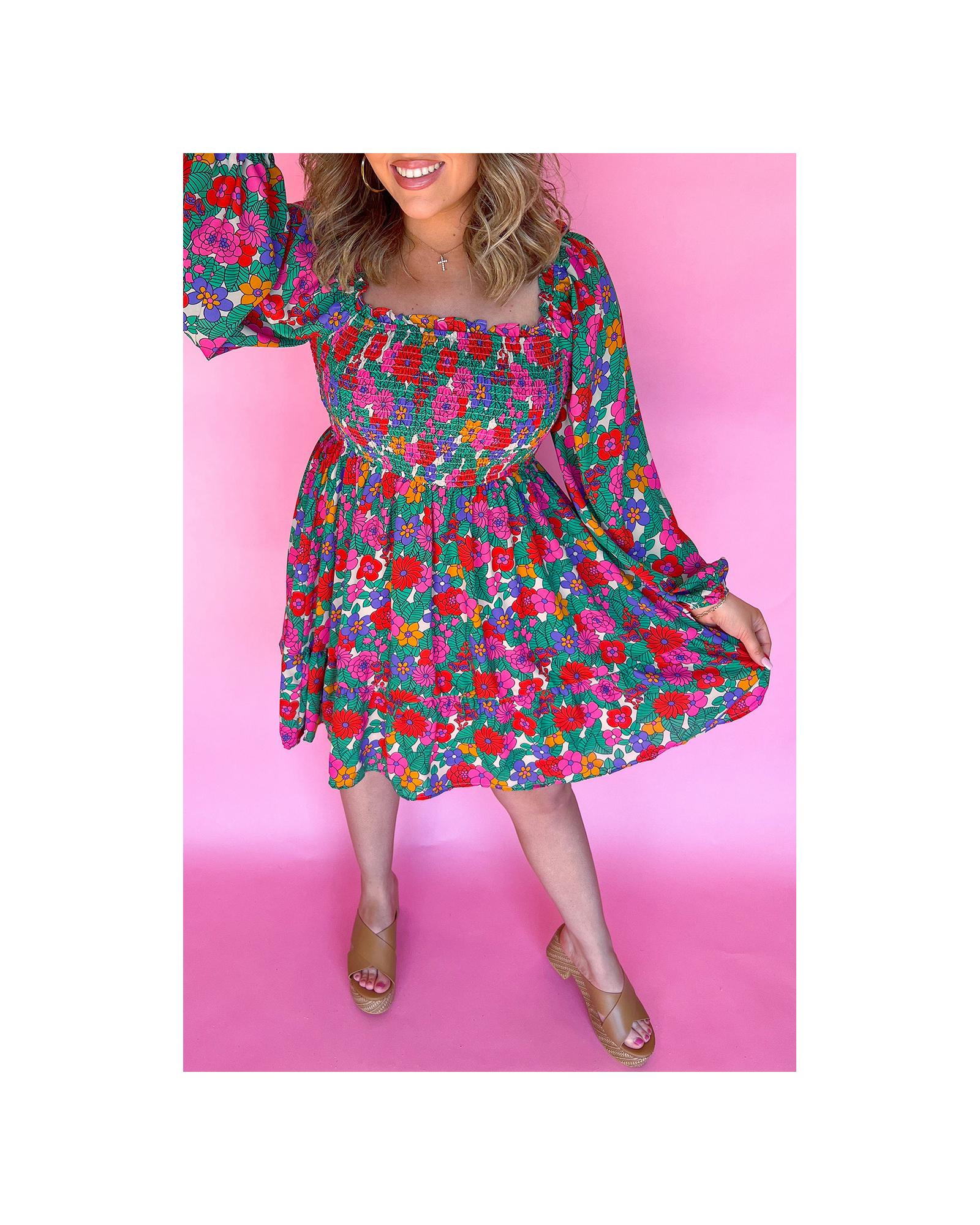 White Plus Size Floral Frilled Square Neck Shirred Long Sleeve Dress - 3X
