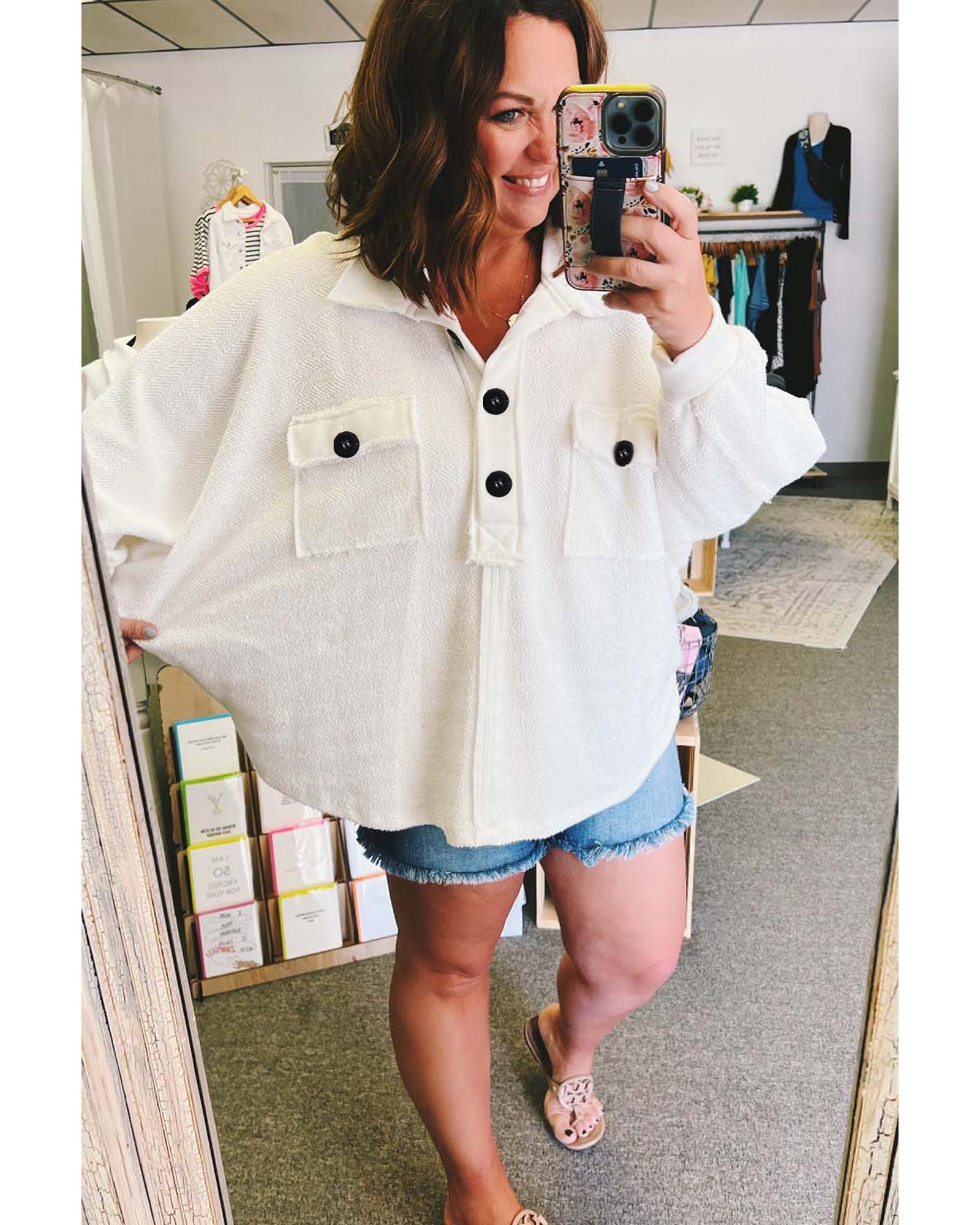White Plus Size Long Sleeve Flap Pocket Henley Top – 3X