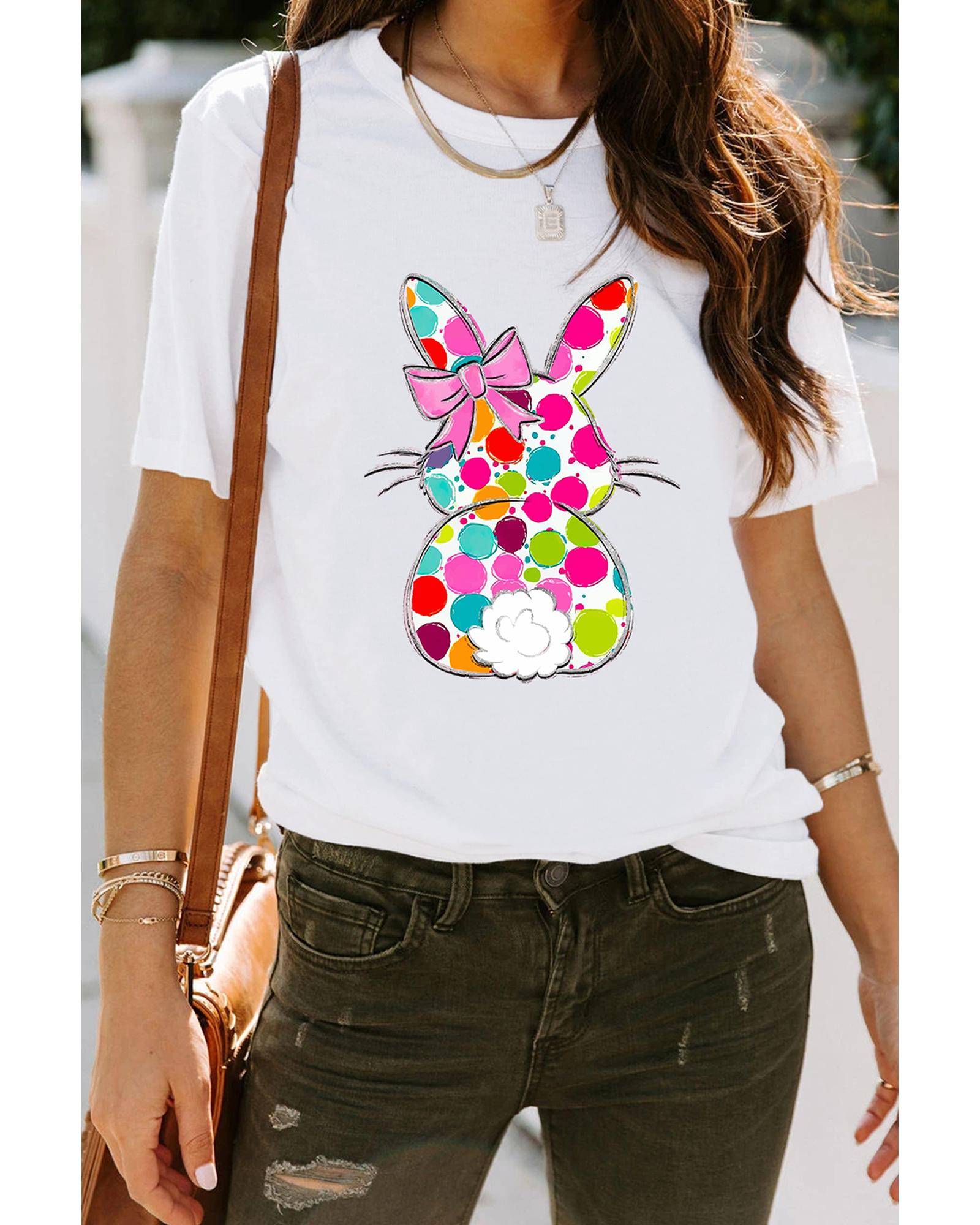 White Polka Dot Bow Rabbit Graphic Crewneck Easter Fashion Tee – M