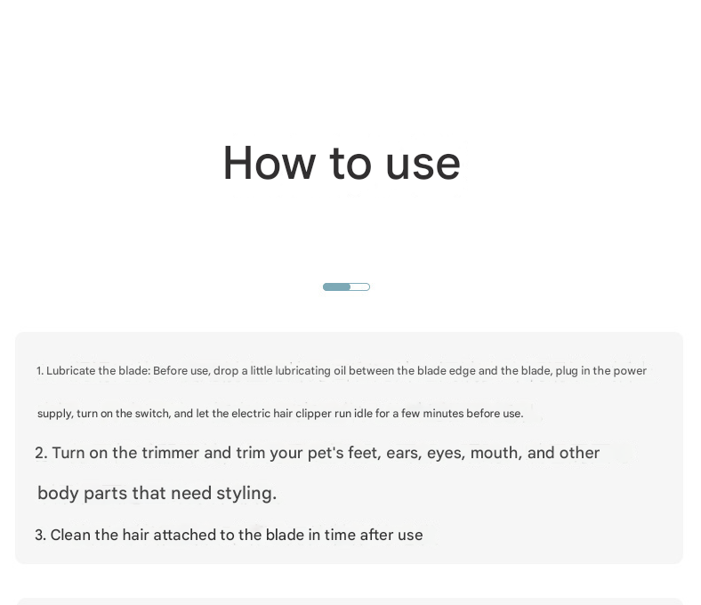 - 2. Gently turn on the trimmer and carefully trim the desired areas on your pet’s paws, face, or ears.