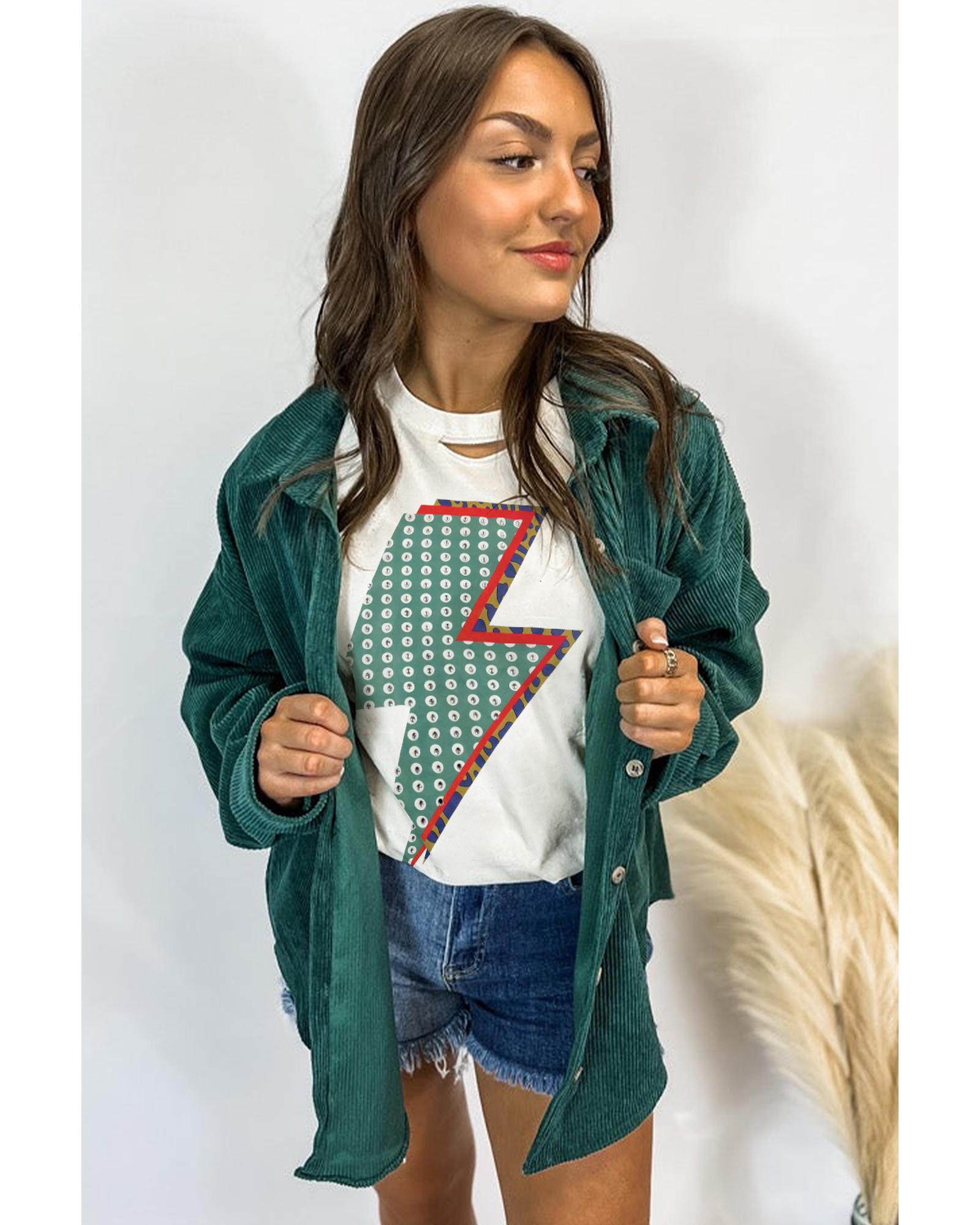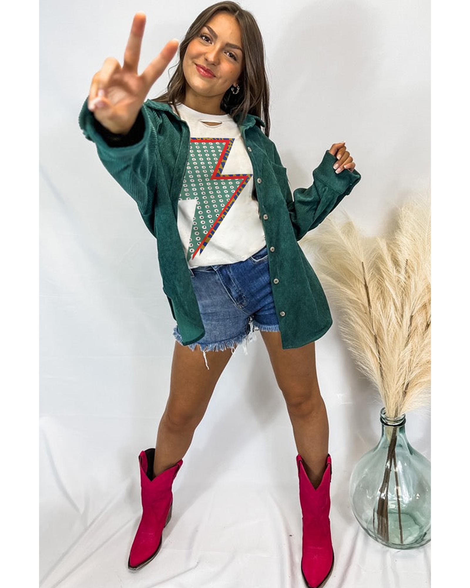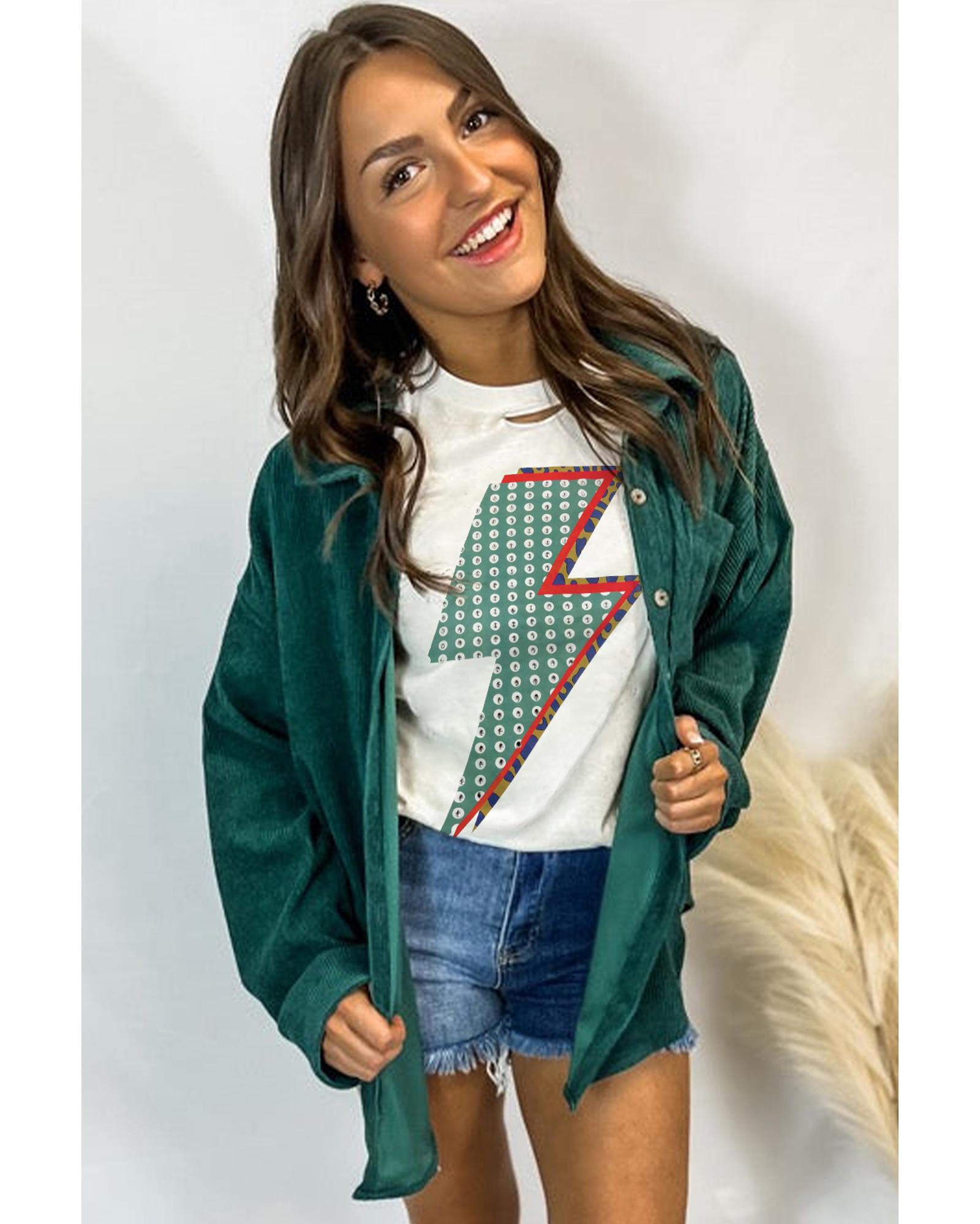 White Rhinestone Decor Bolt Graphic Ripped Western Tee – L