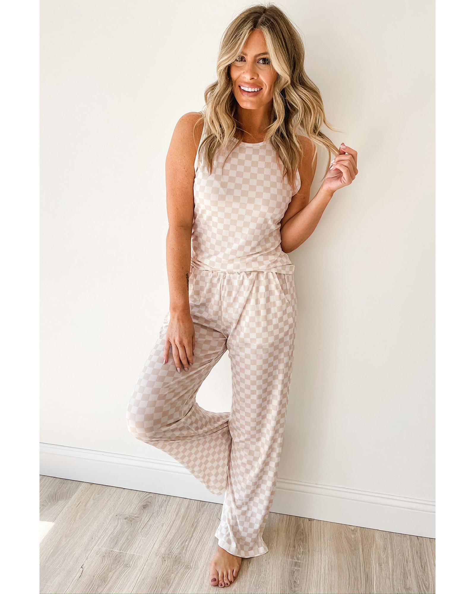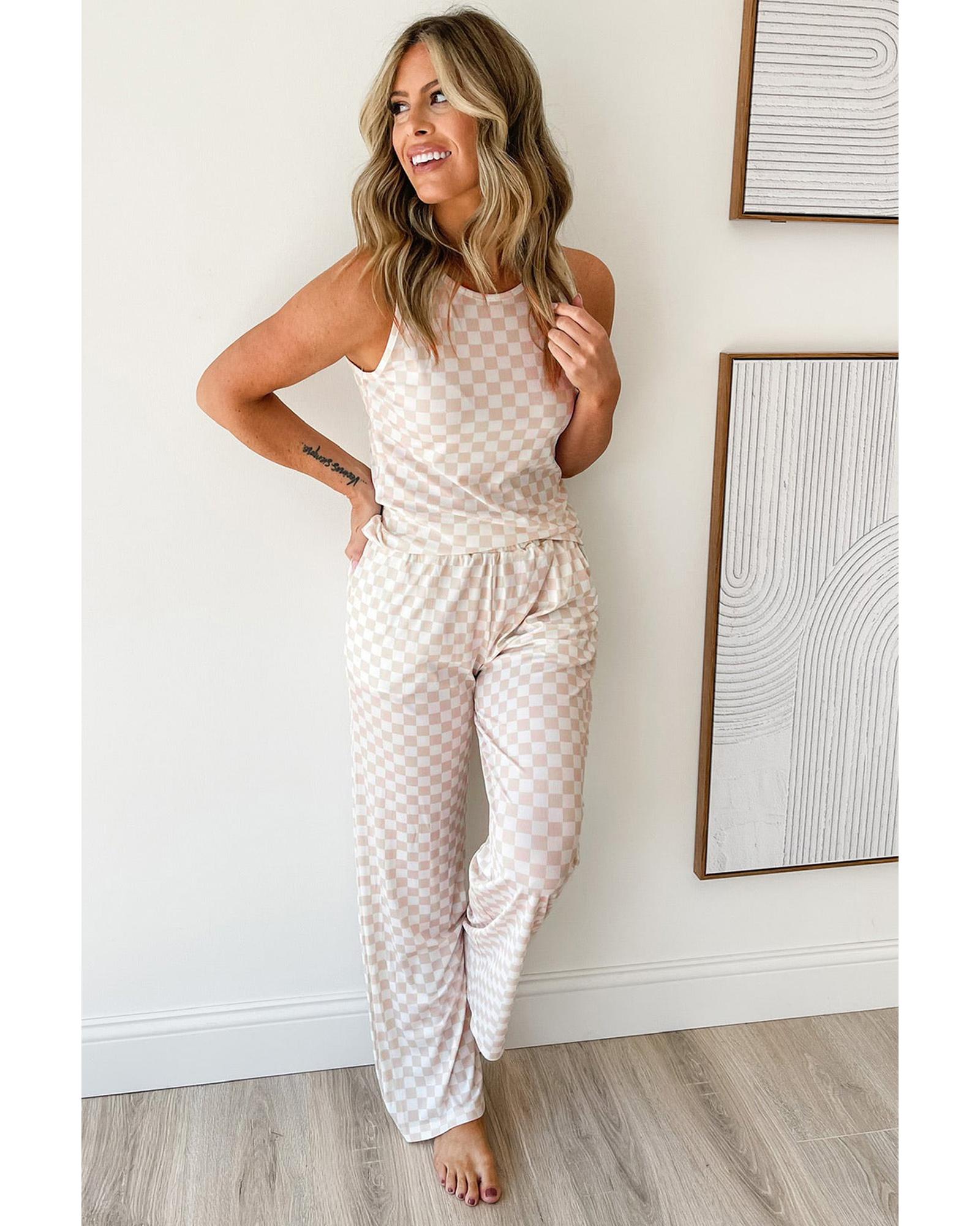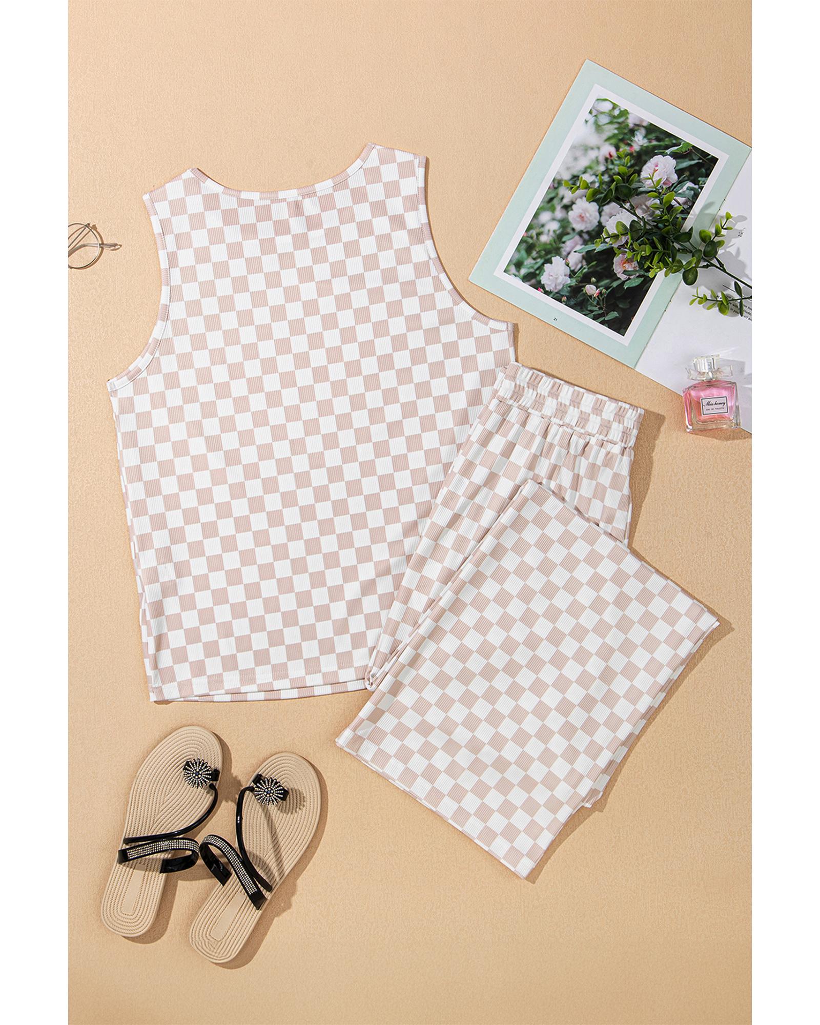 - White Ribbed Texture Checkered Print 2pcs Tank and Pants Set