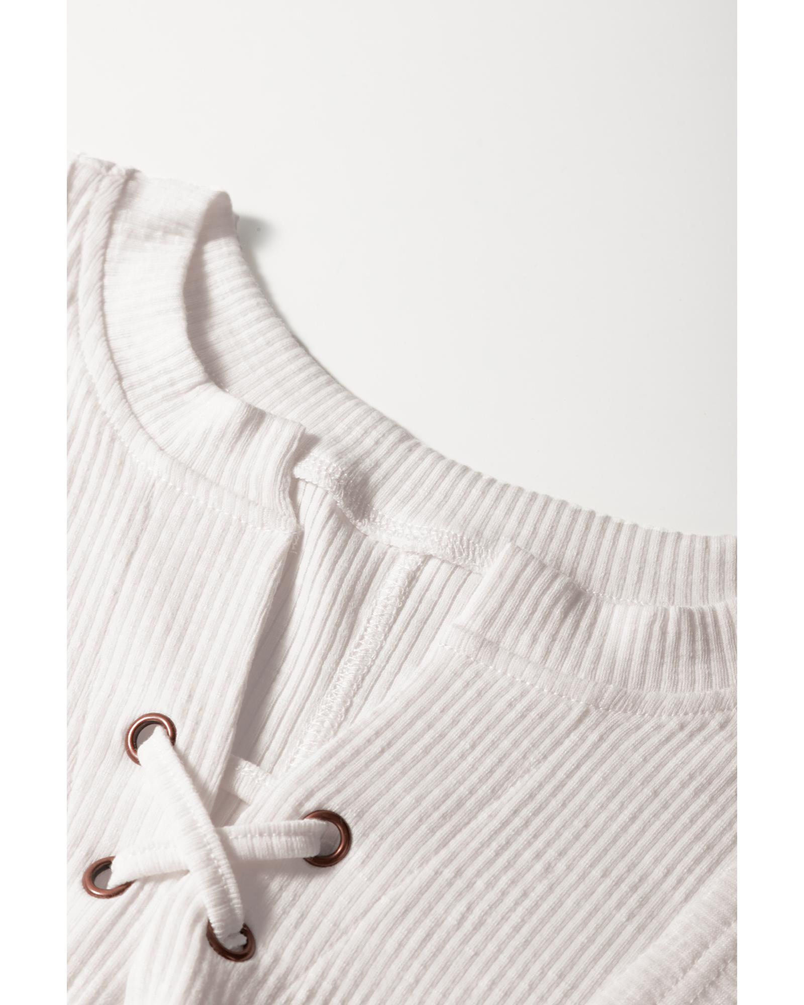 White Ribbed Texture Lace Patchwork Short Sleeve Top – M