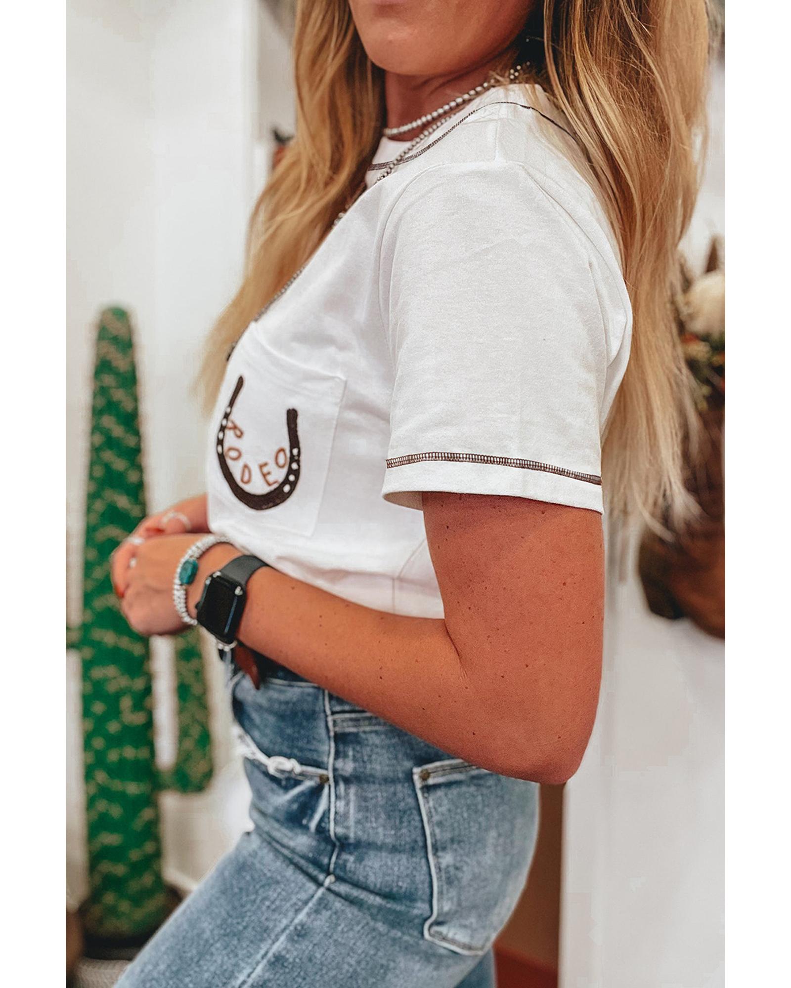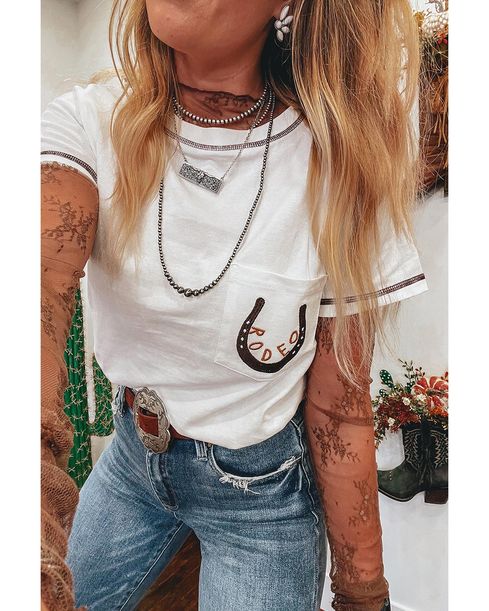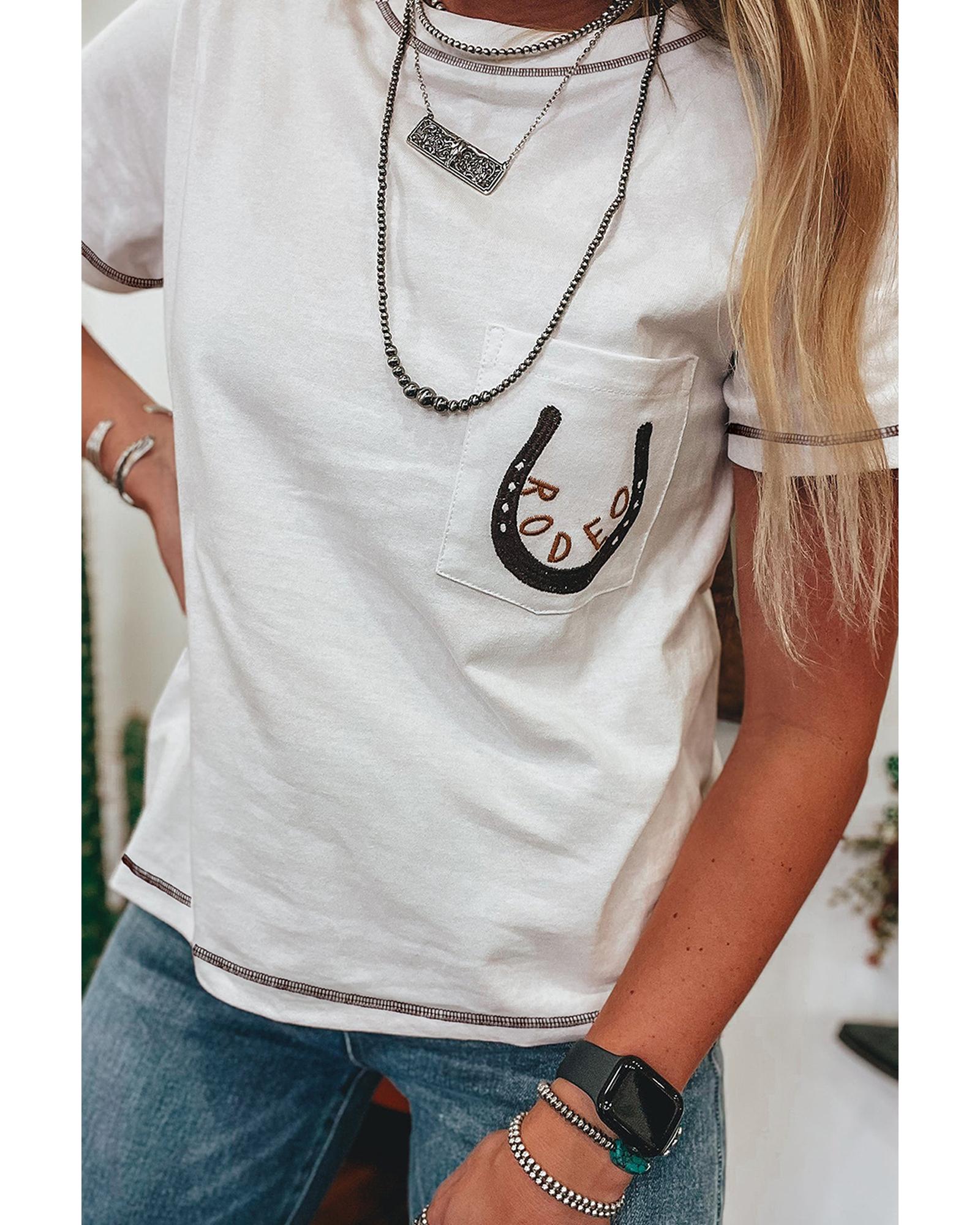 White RODEO Horseshoe Embroidered Patch Pocket T Shirt – L