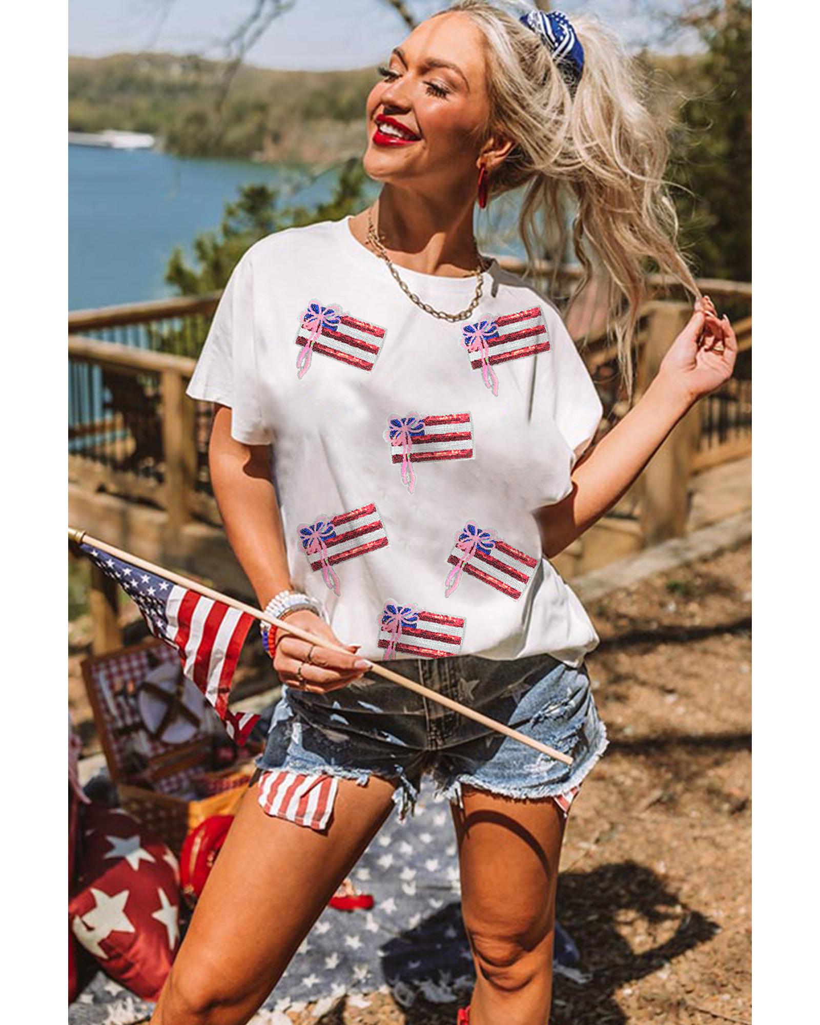 White Sequin Bow American Flag Patched T Shirt – XL
