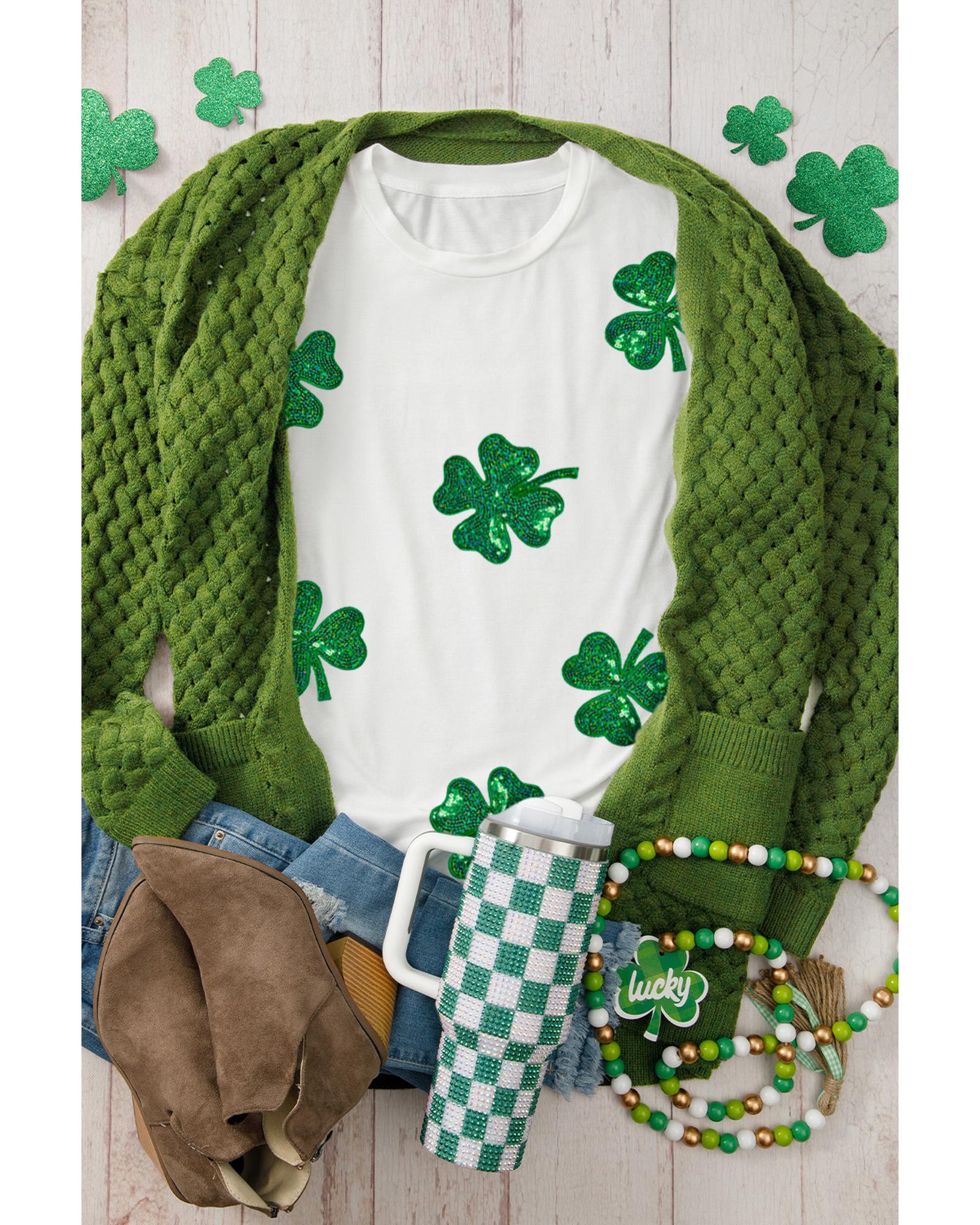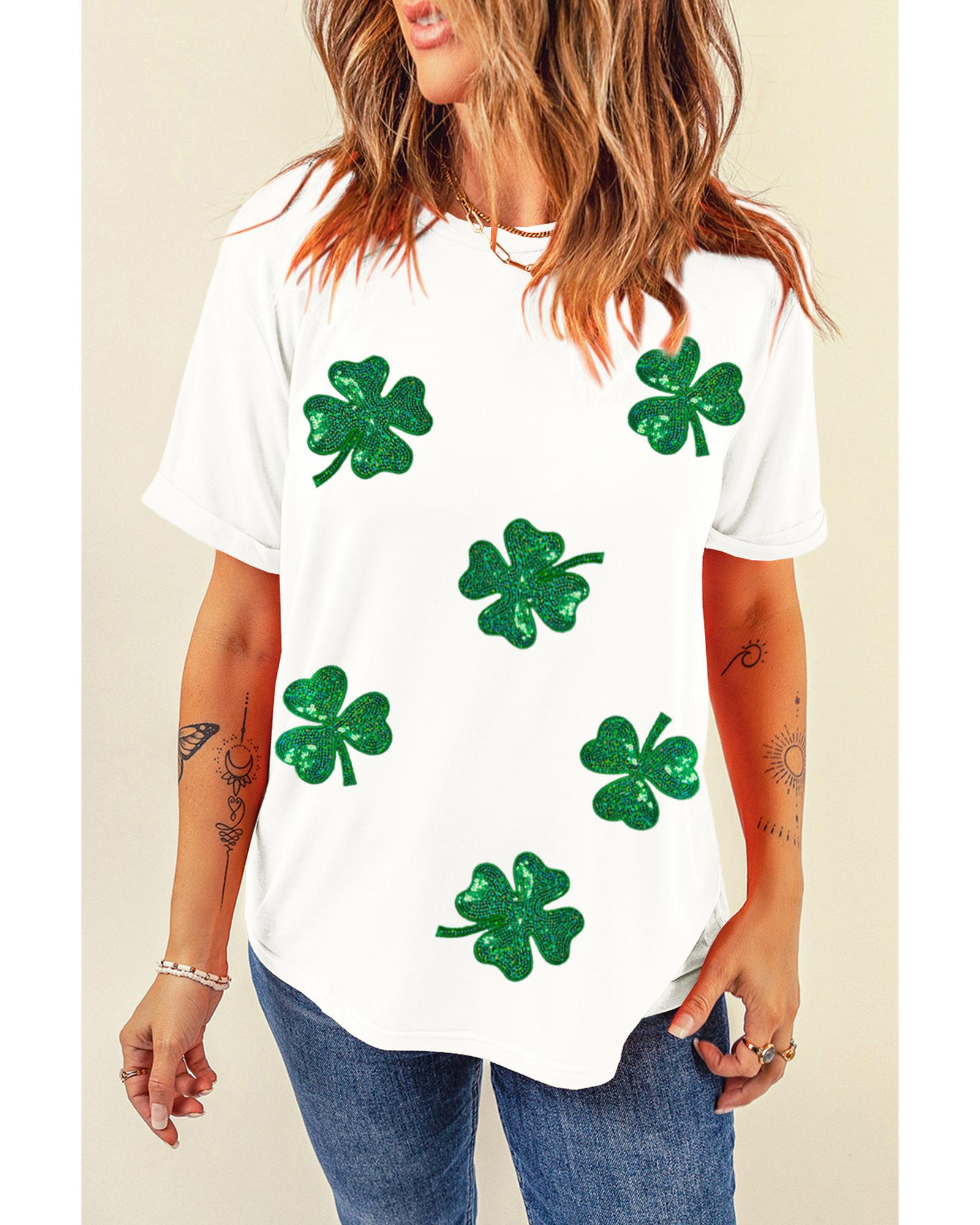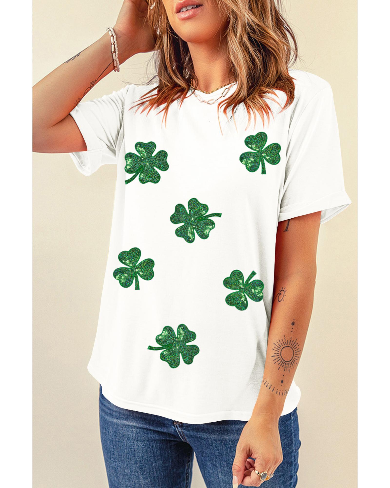 White Sequin Lucky Clover Graphic Crewneck Tee – XL