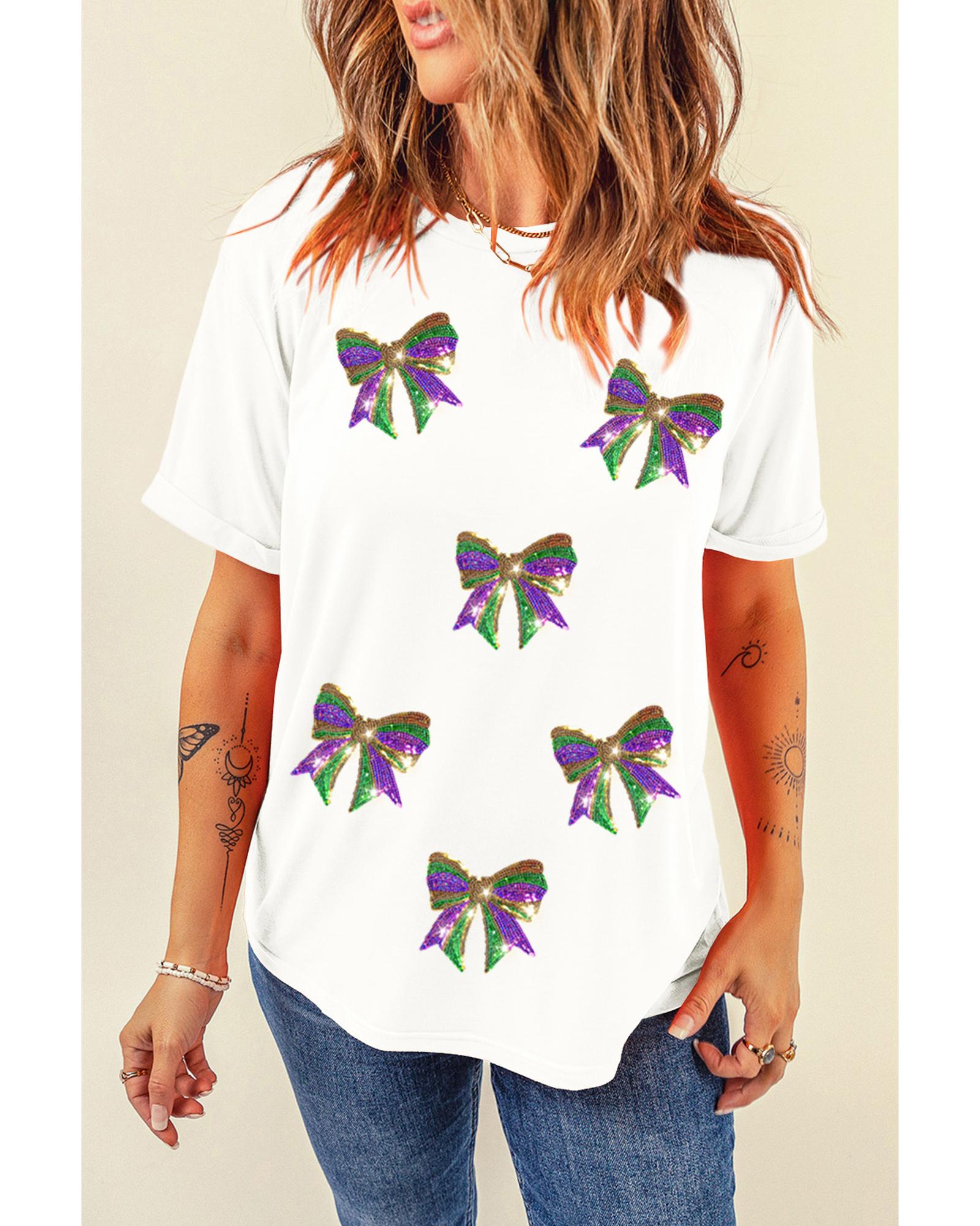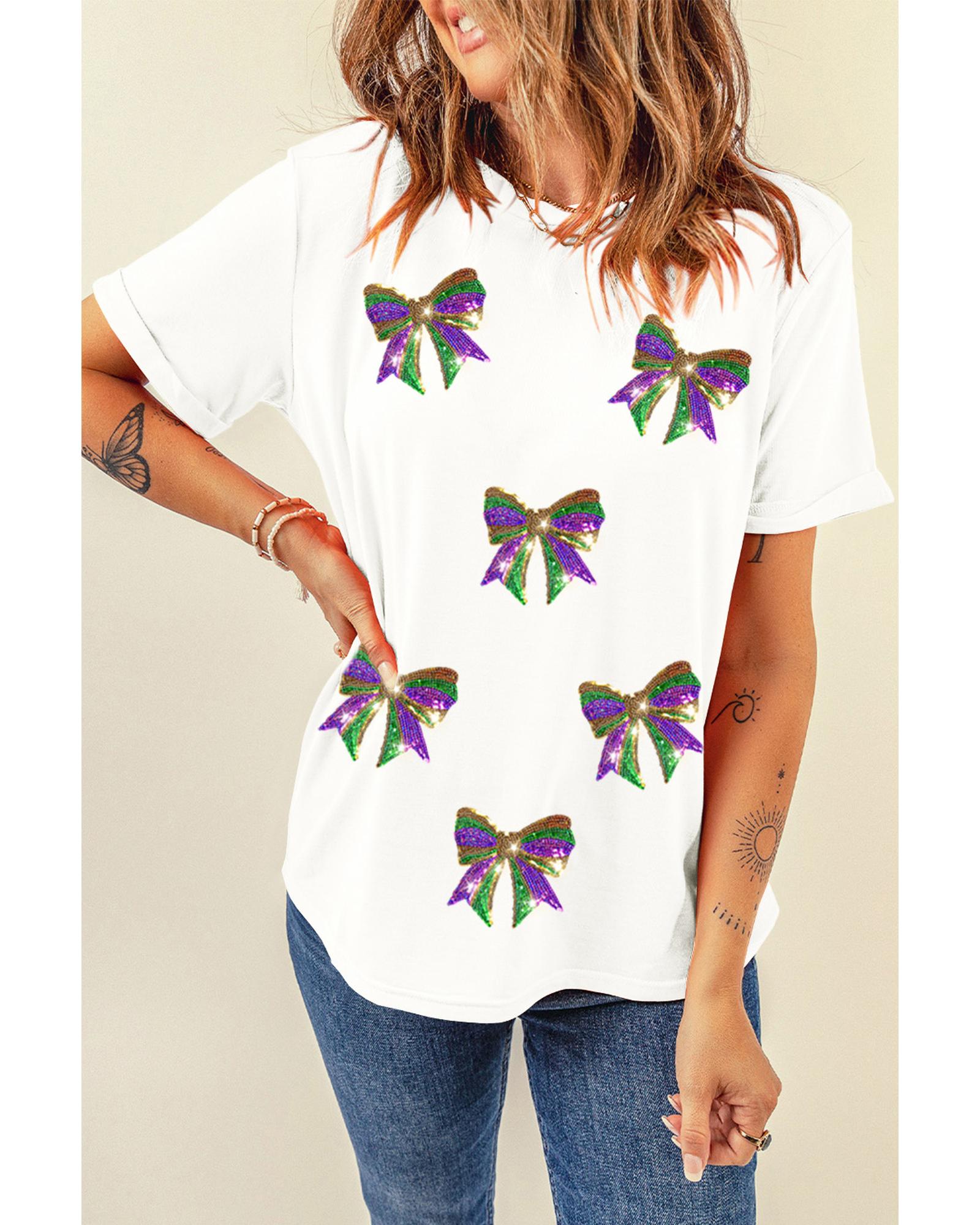 White Sequin Mardi Gras Bow Graphic Crewneck Tee – 3XL