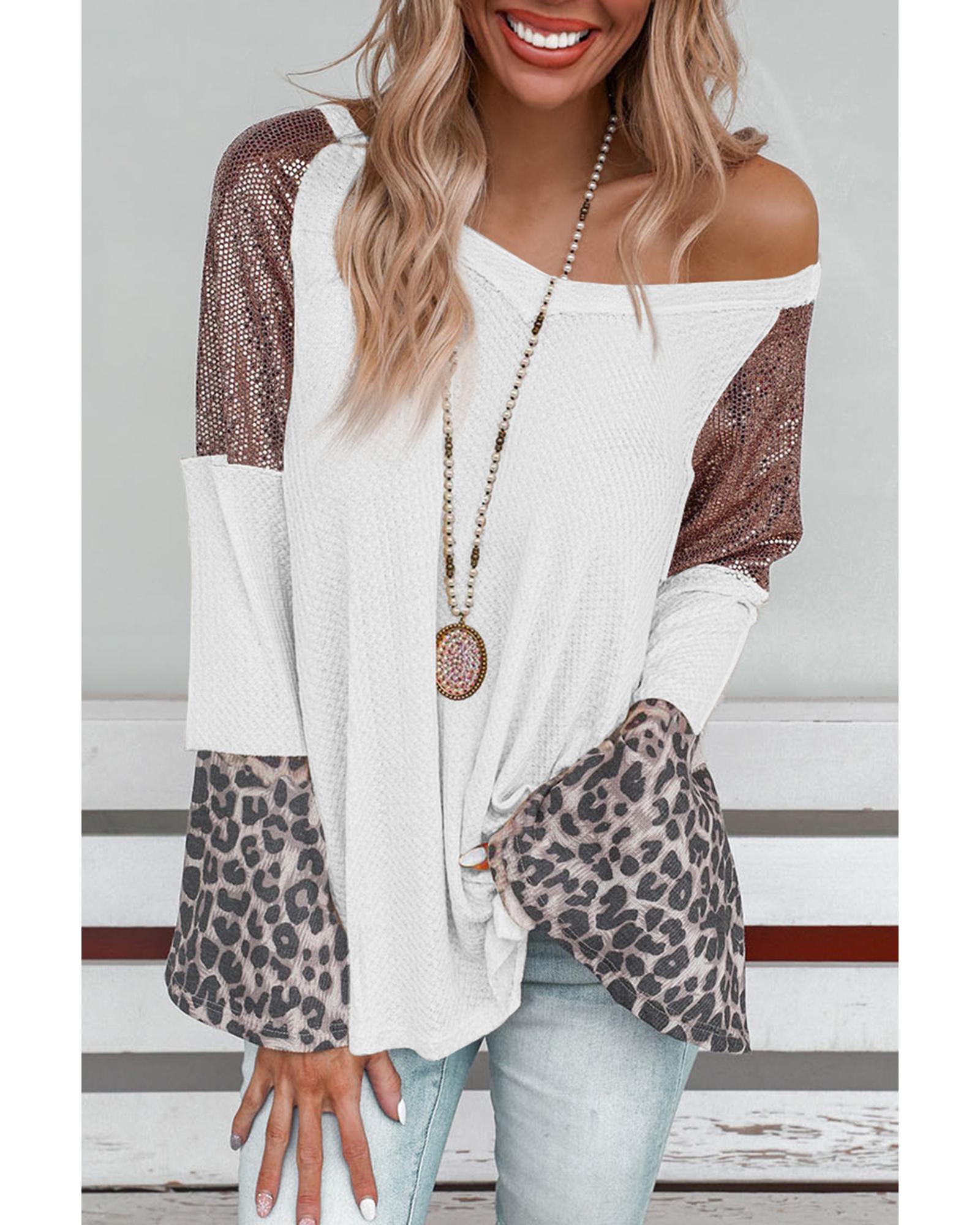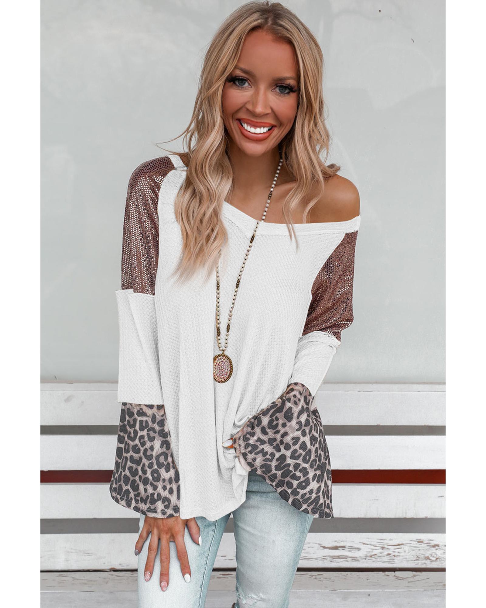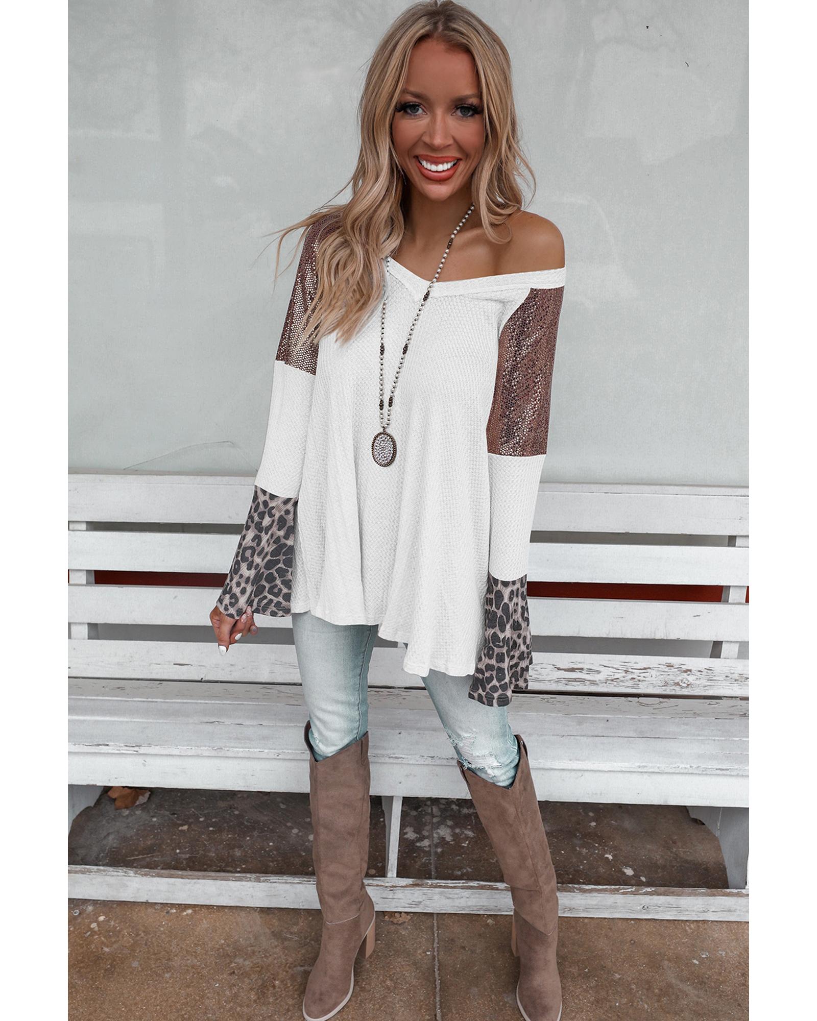 - White Sequin Patchwork Bell Sleeve V Neck Tunic Top