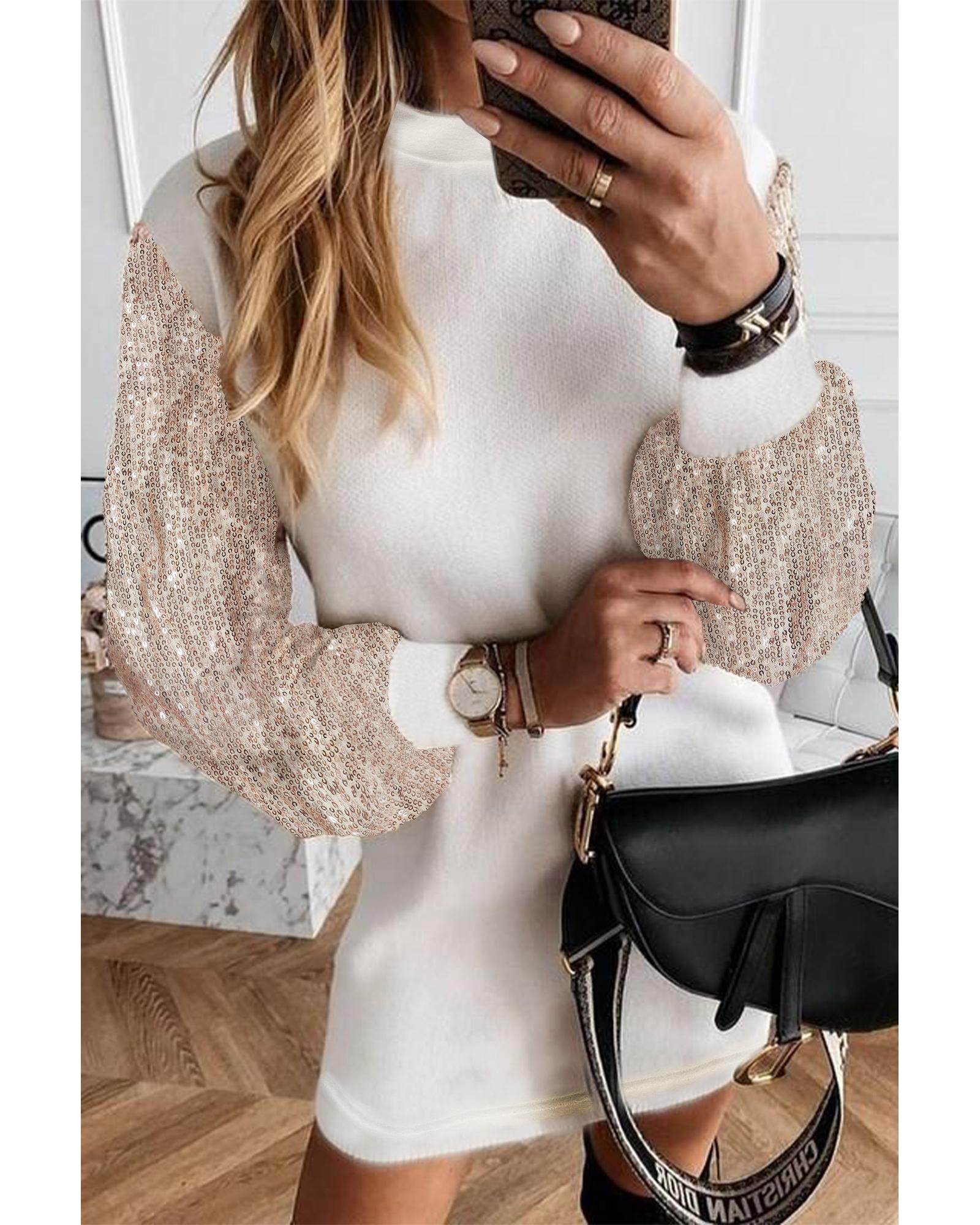 White Sequin Puff Sleeve Shift Mini Dress – XL