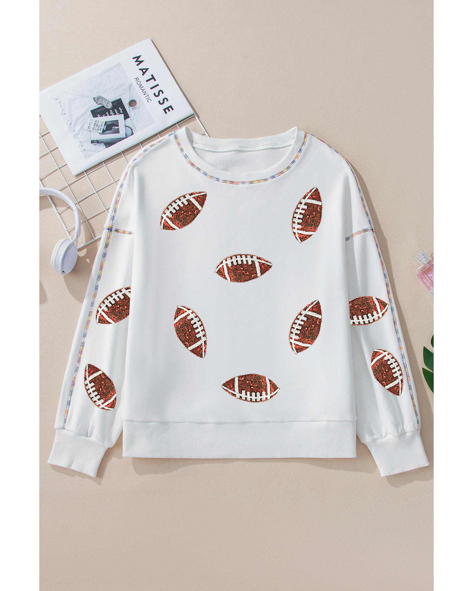 White Sequin Rugby Football Pattern Exposed Seam Game Day Sweatshirt – M