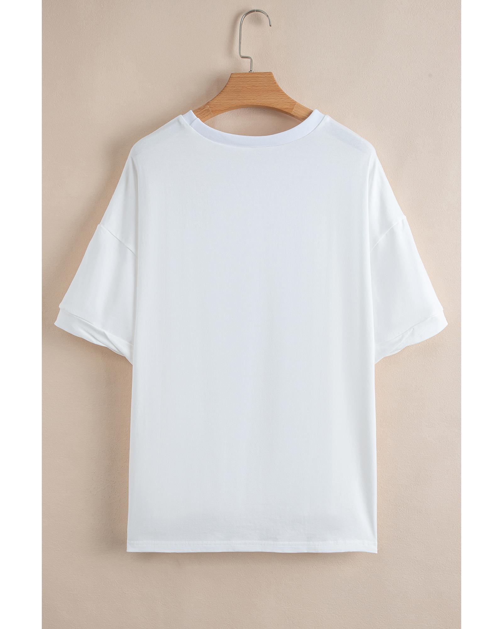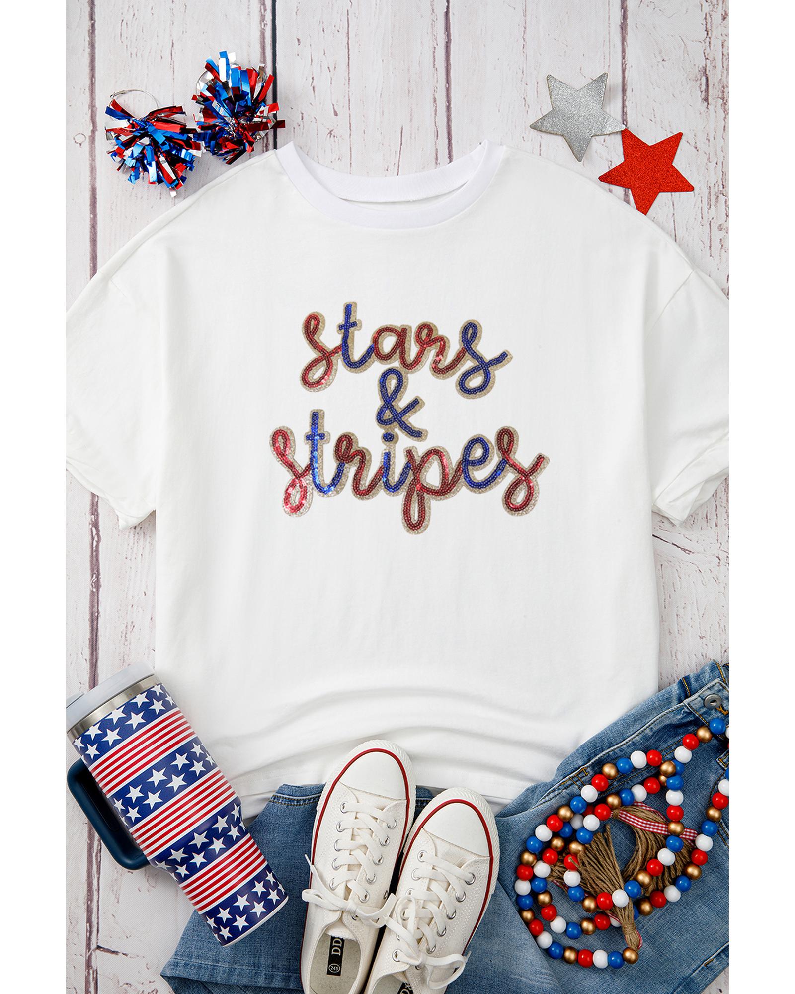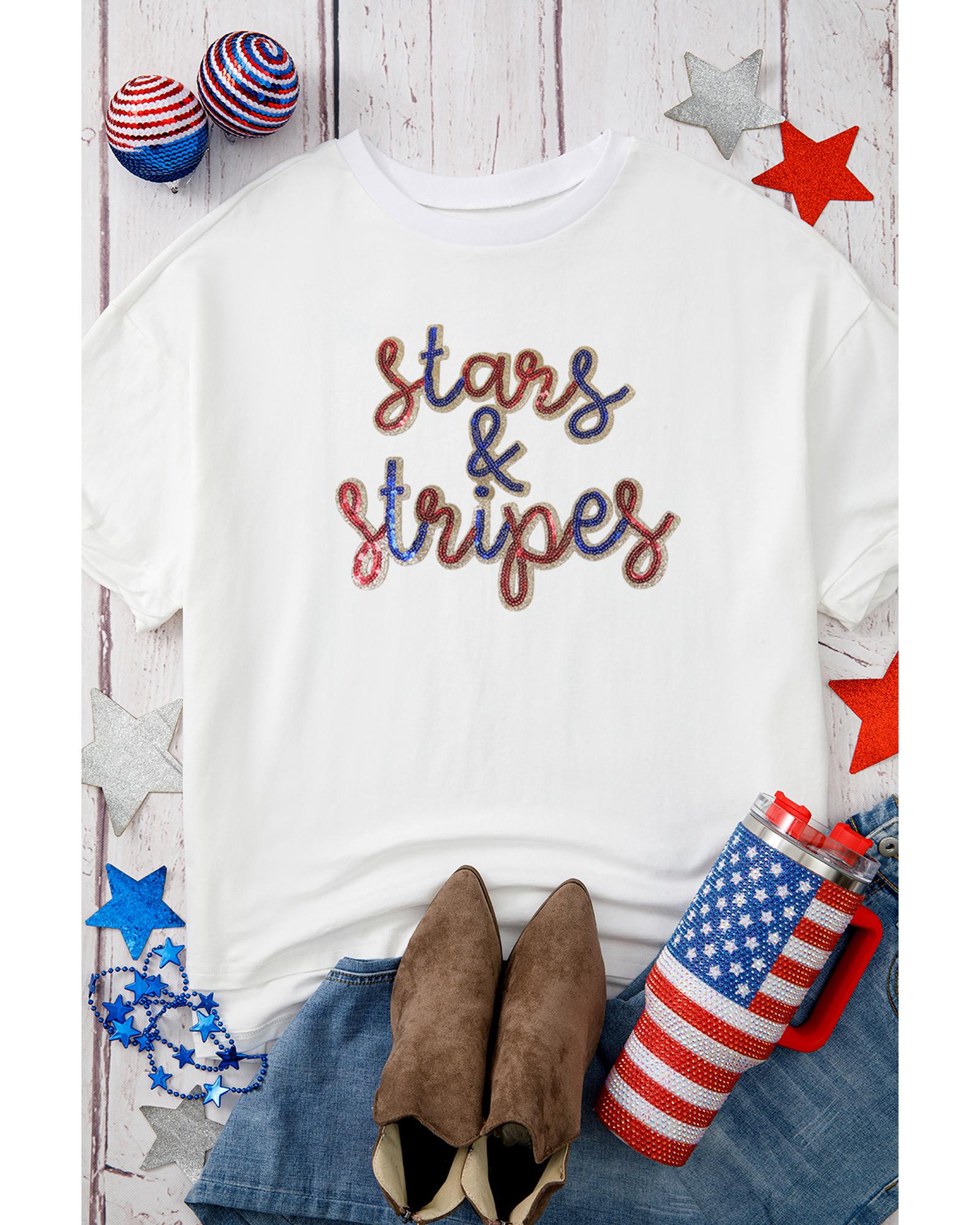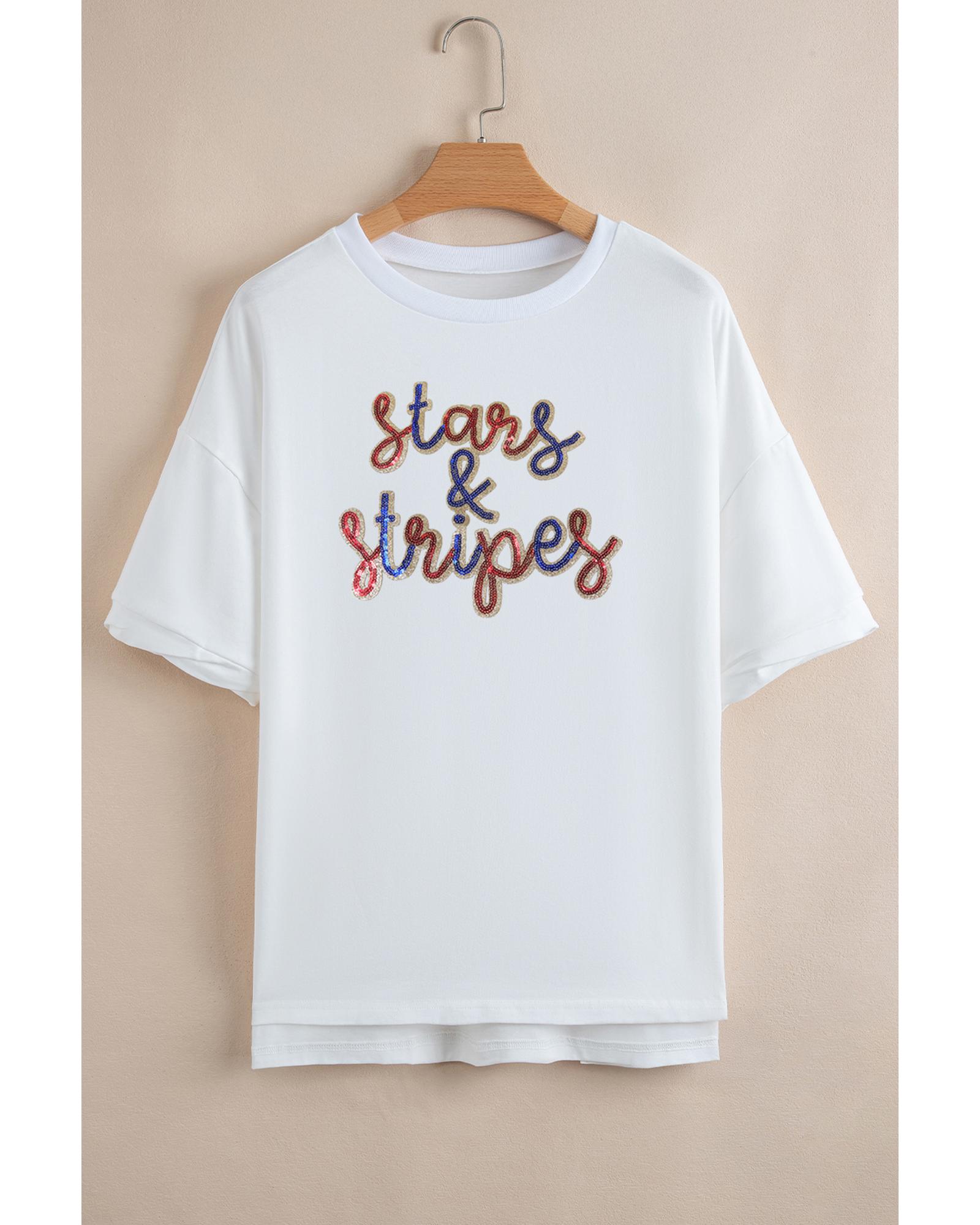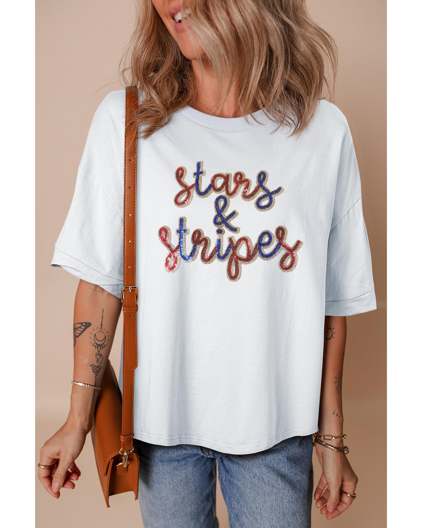White Sequin stars & stripes Graphic Drop Shoulder Loose T Shirt – L