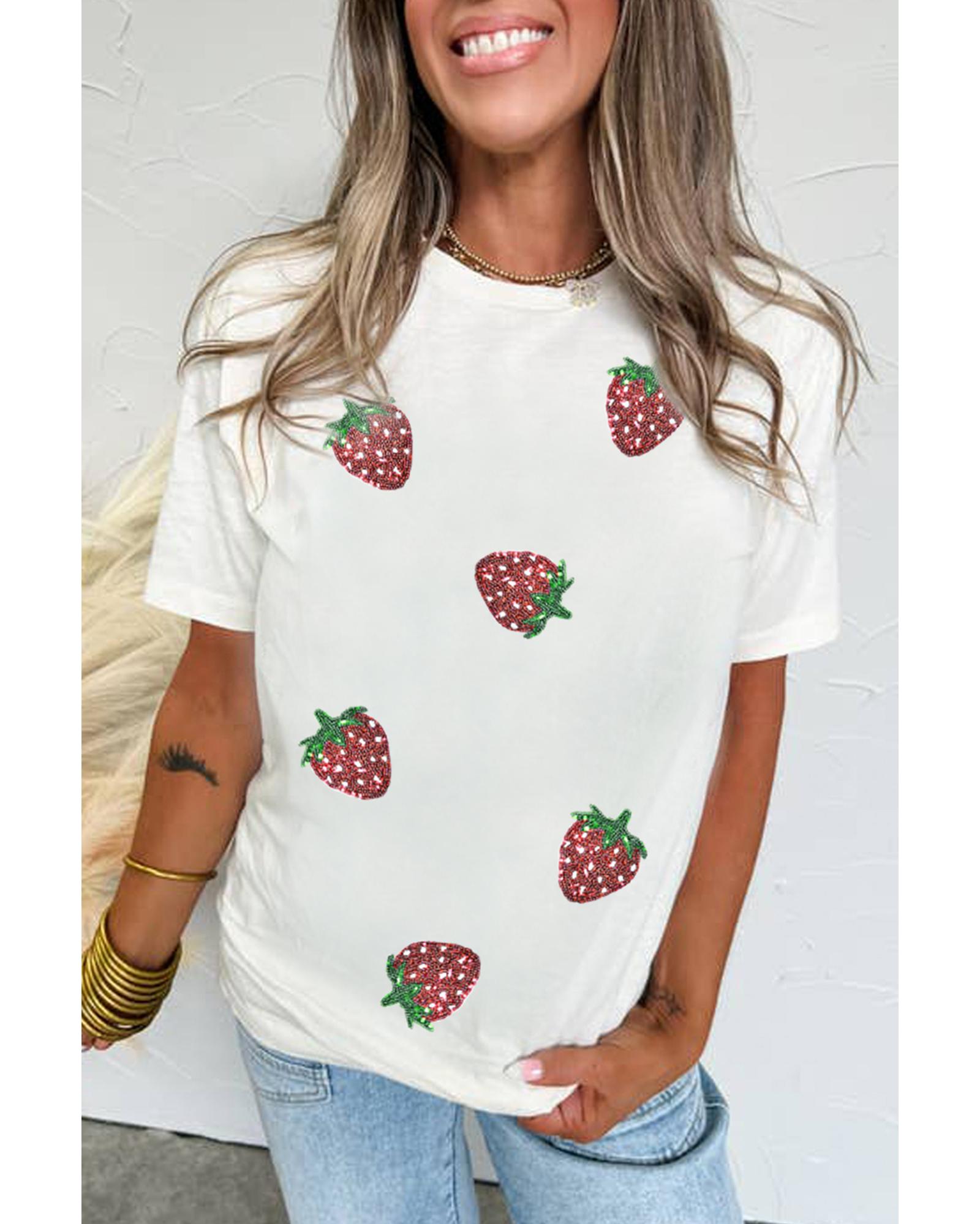 White Sequin Strawberry Patched Crew Neck T Shirt – 2XL