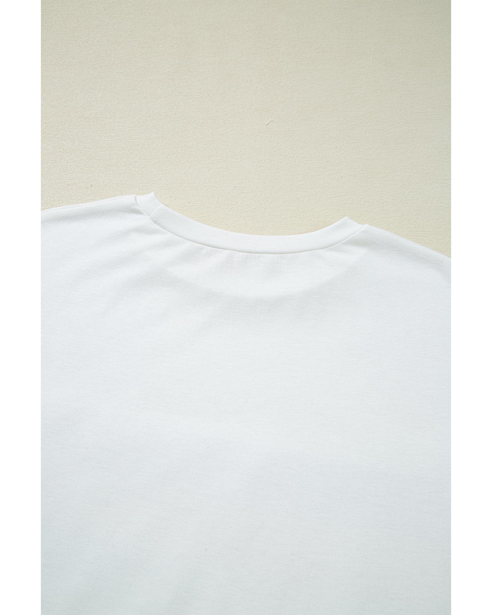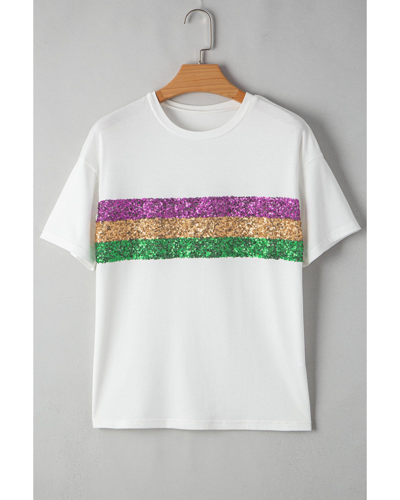 White Sequin Stripes Patchwork Mardi Gras Crew Neck T Shirt – S