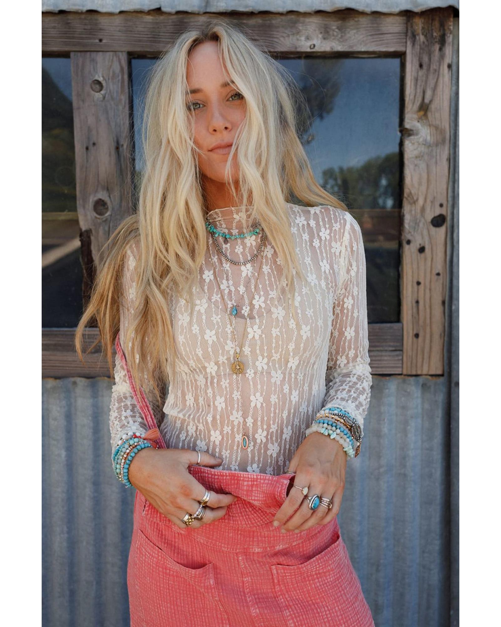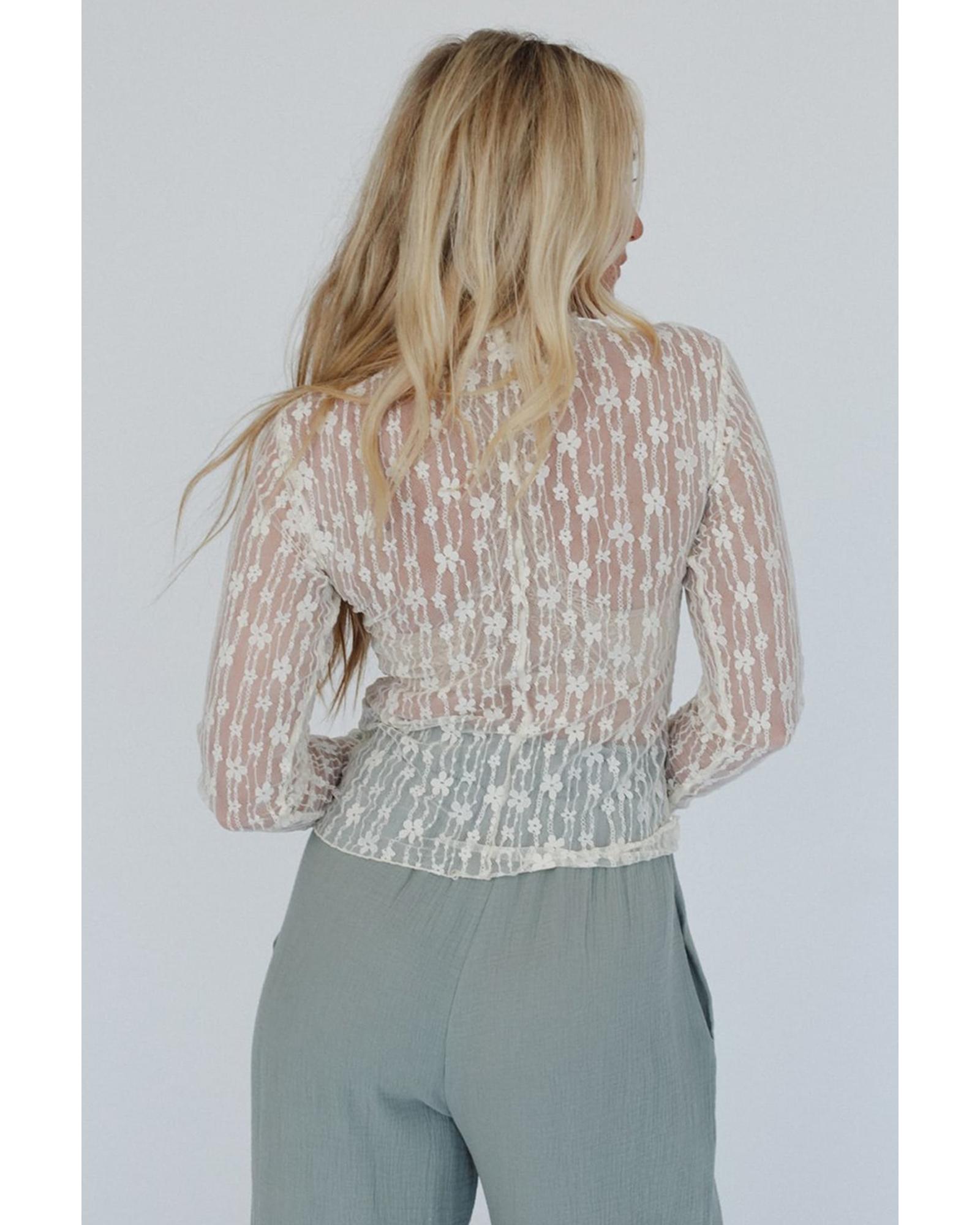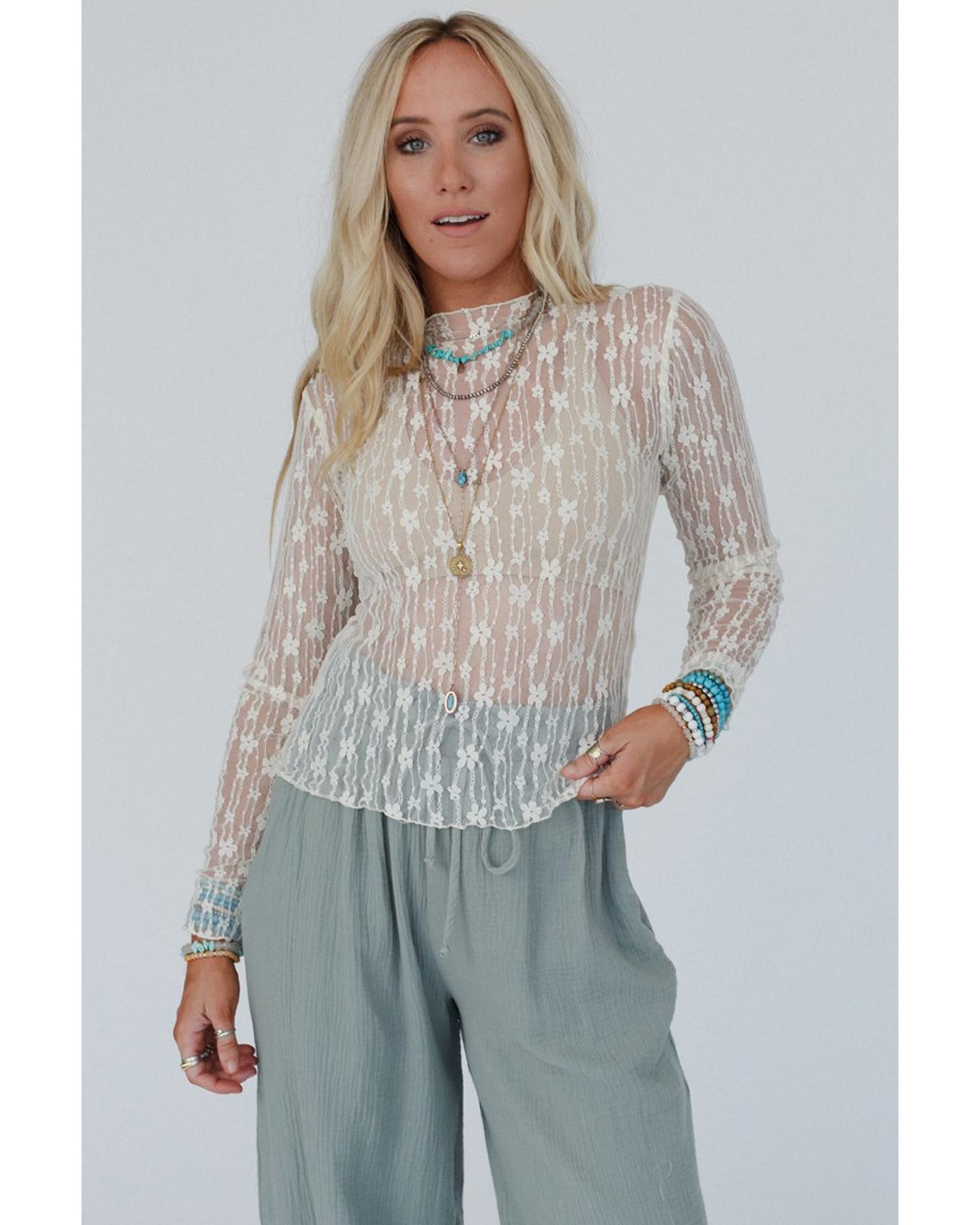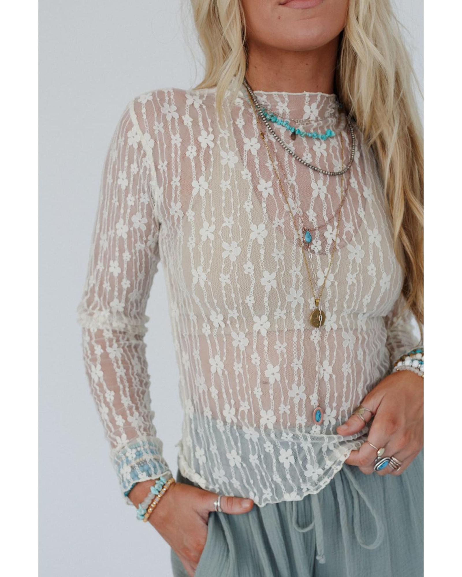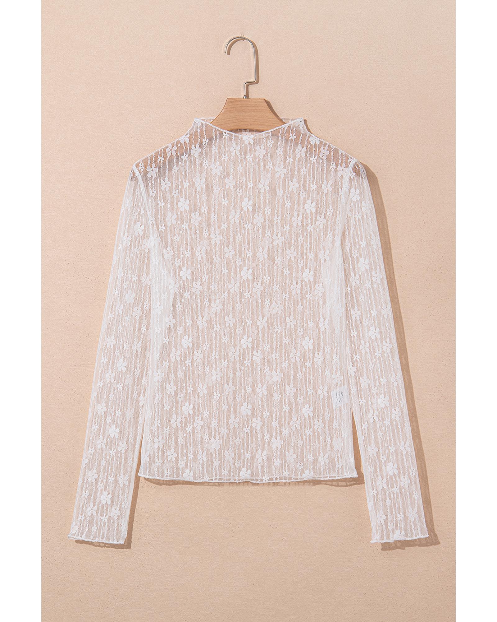 White Sheer Floral Lace Long Sleeve Slim Fit Top – L