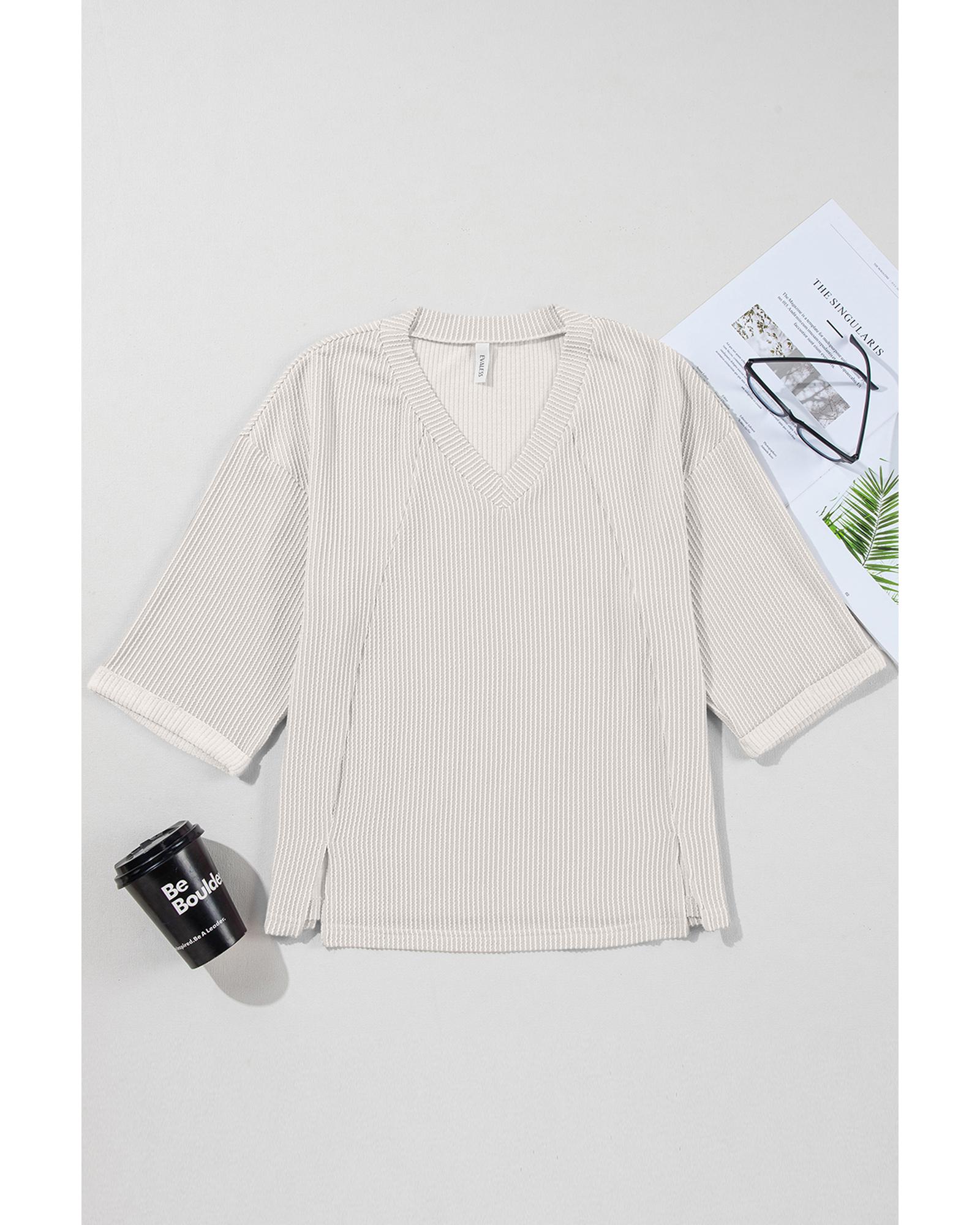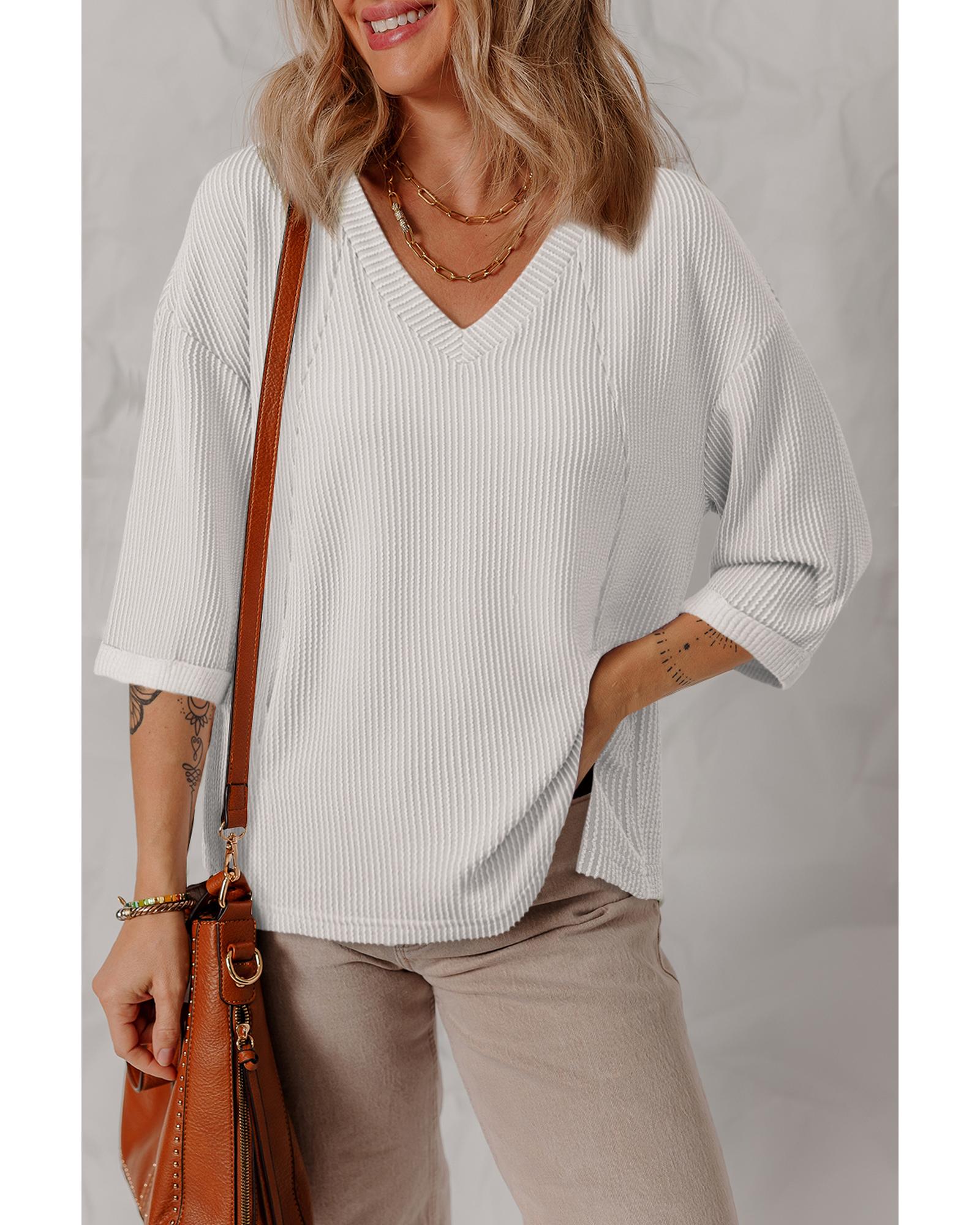 White Solid Color Corded Drop Shoulder 3/4 Sleeve V Neck Top – M