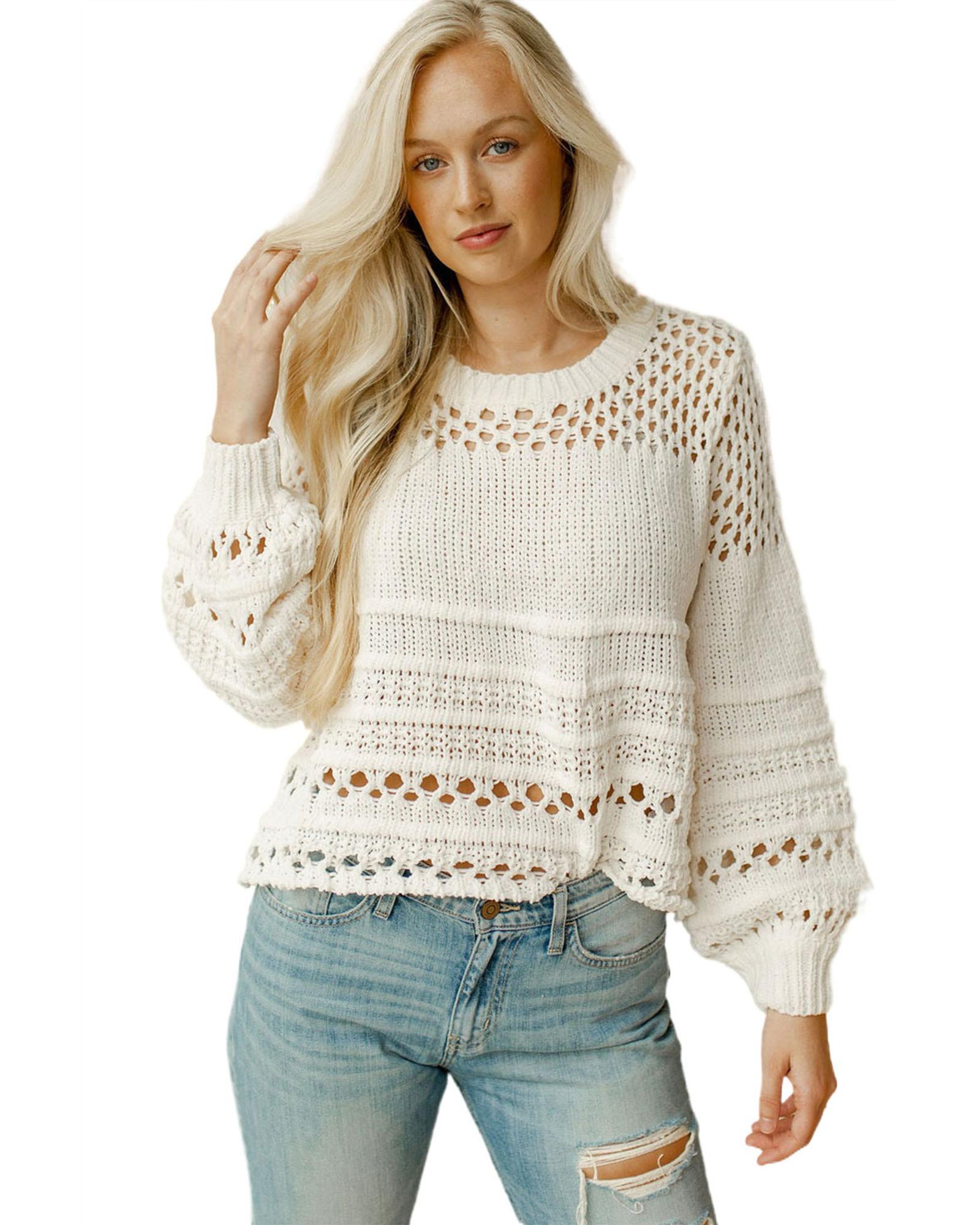 White Solid Color Pointelle Knit Puff Sleeve Sweater – XL