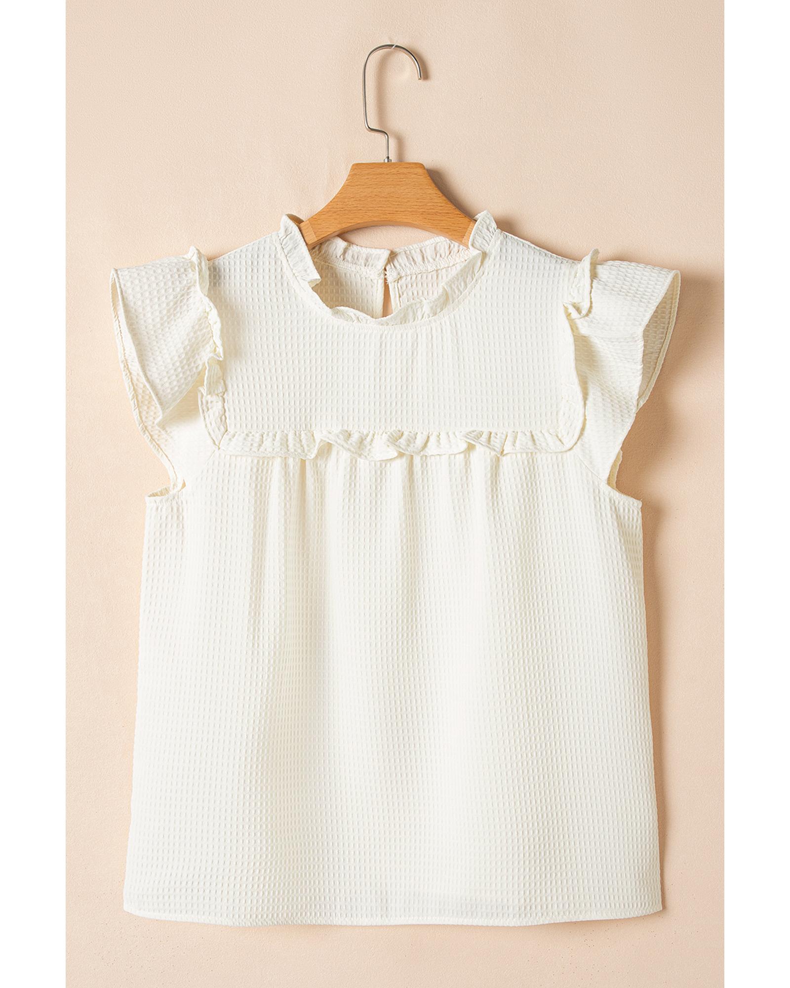 White Solid Color Ruffle Trim Waffle Knit Blouse – L