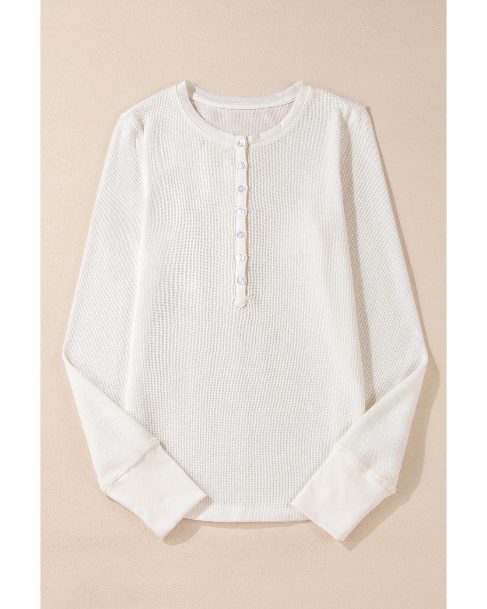 White Solid Color Waffle Half Button Long Sleeve Top – M