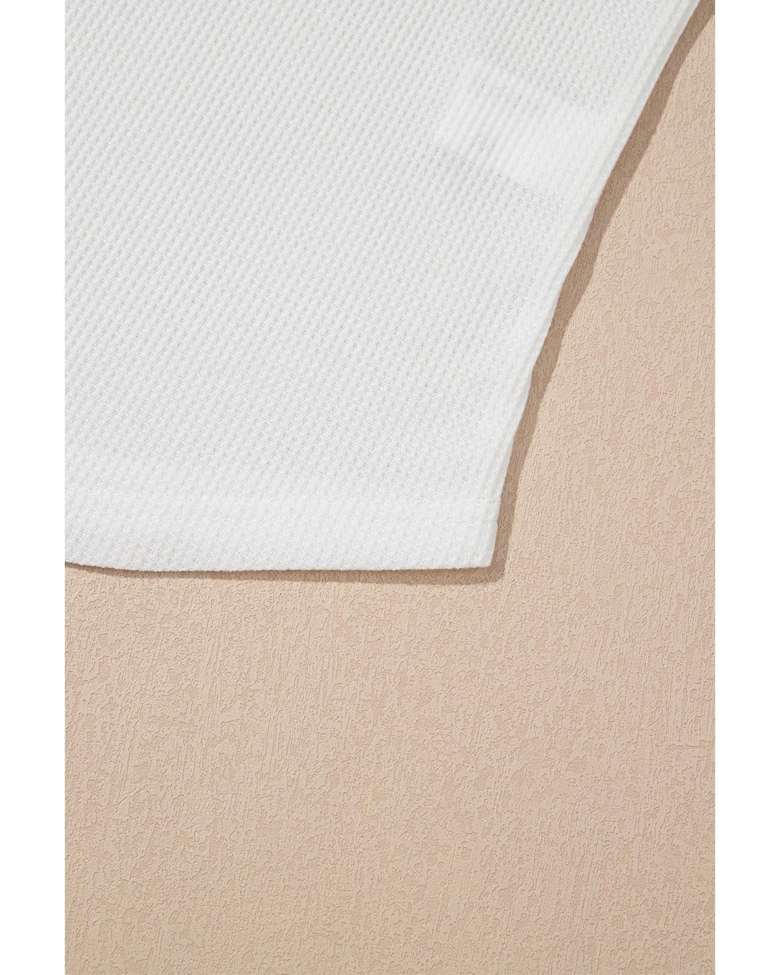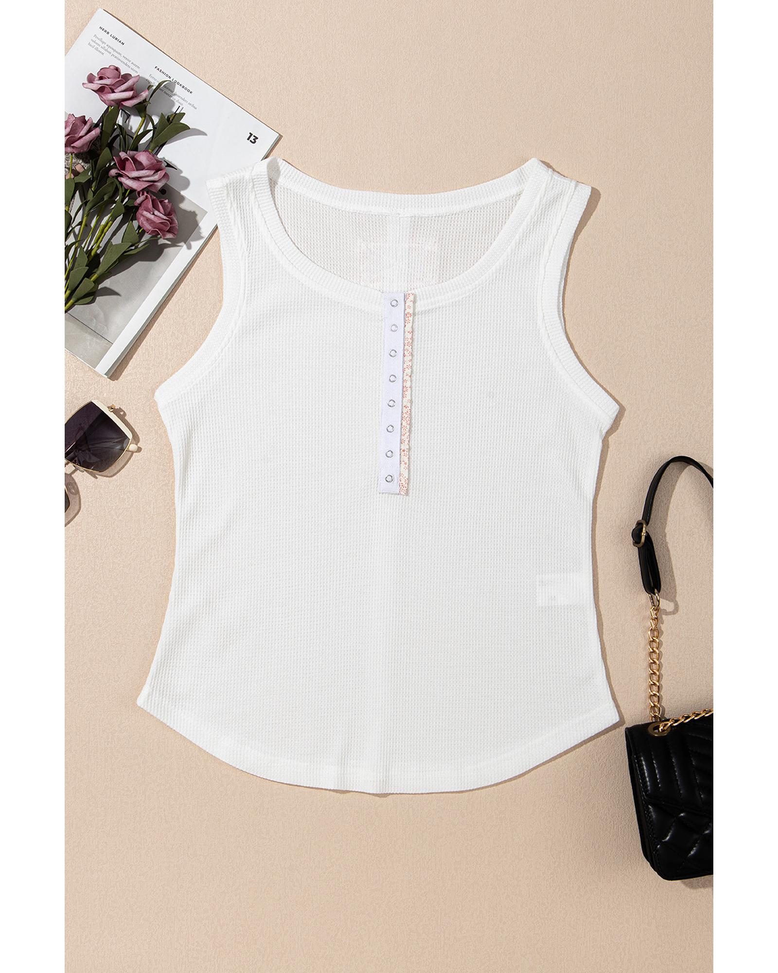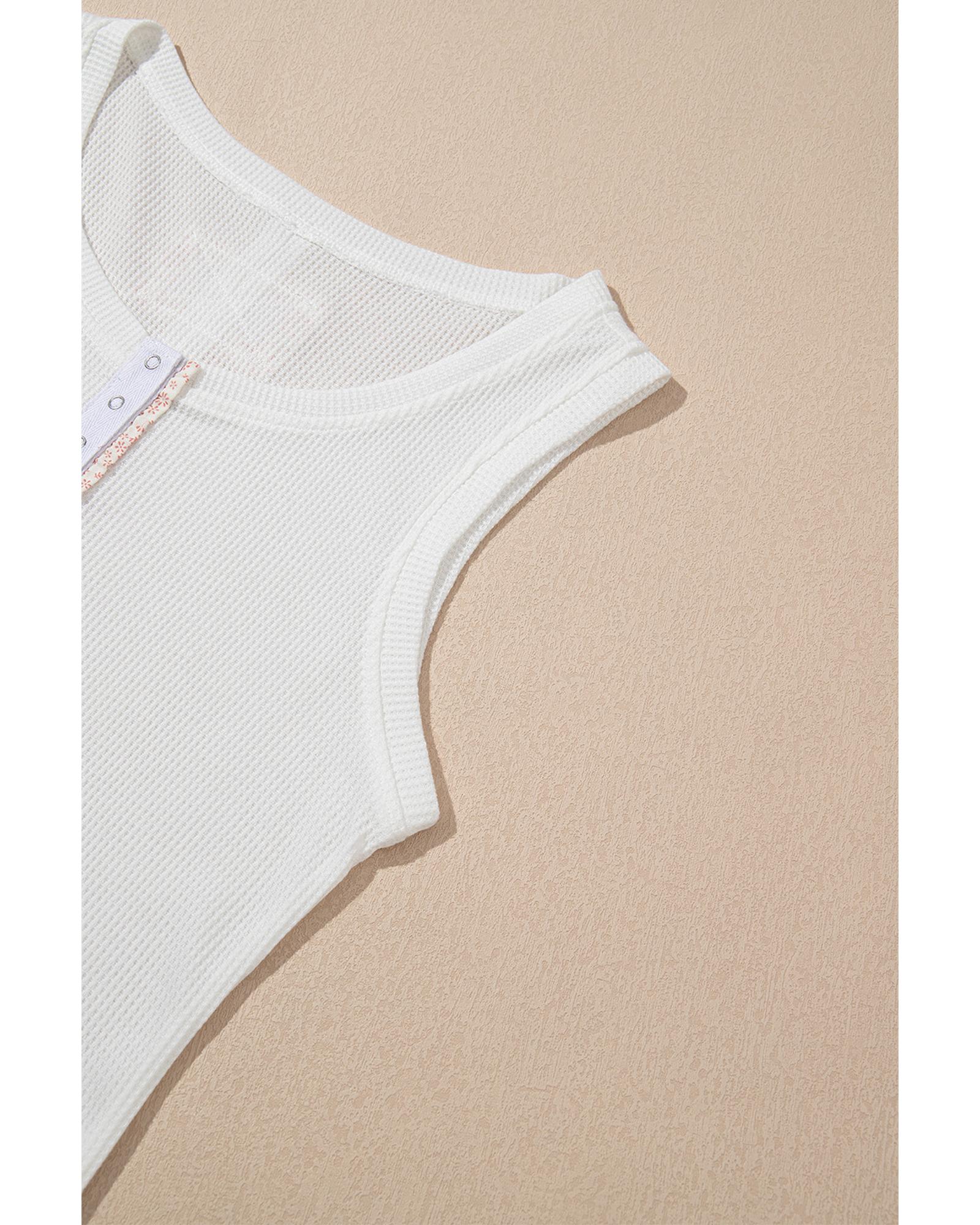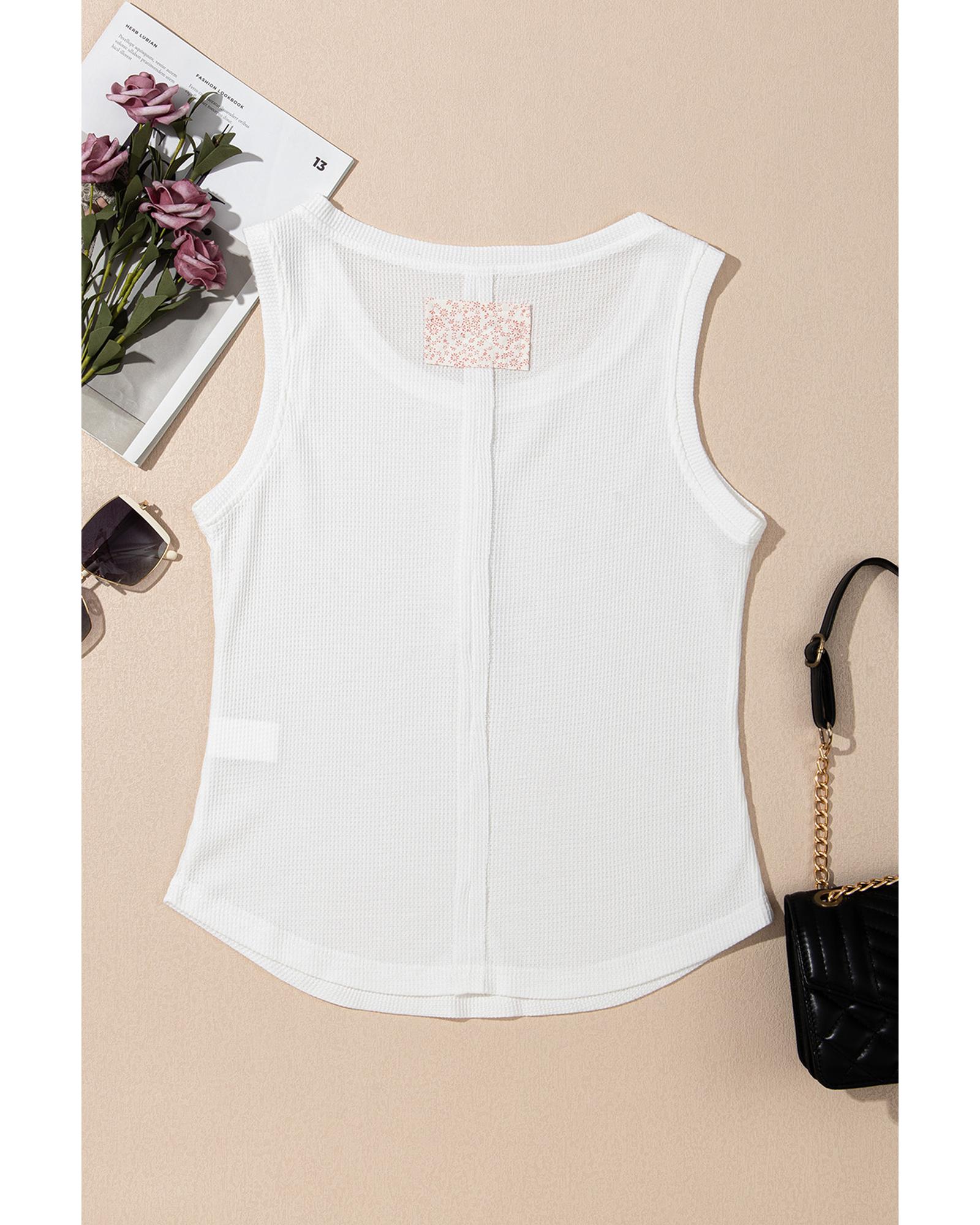 White Solid Color Waffle Knit Half Buttons Tank Top – S