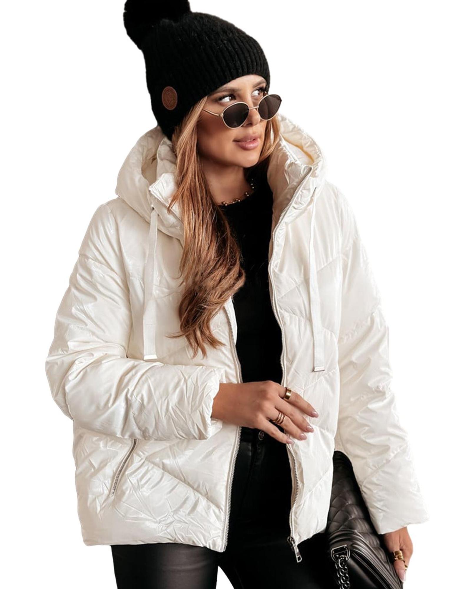 White Solid Quilted Hooded Zip Up Puffer Coat – 2XL