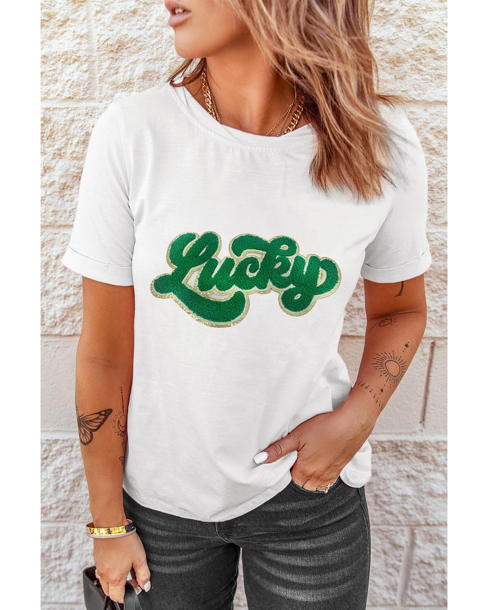 White St. Patrick Lucky Chenille Glitter Patched Graphic T Shirt – XL