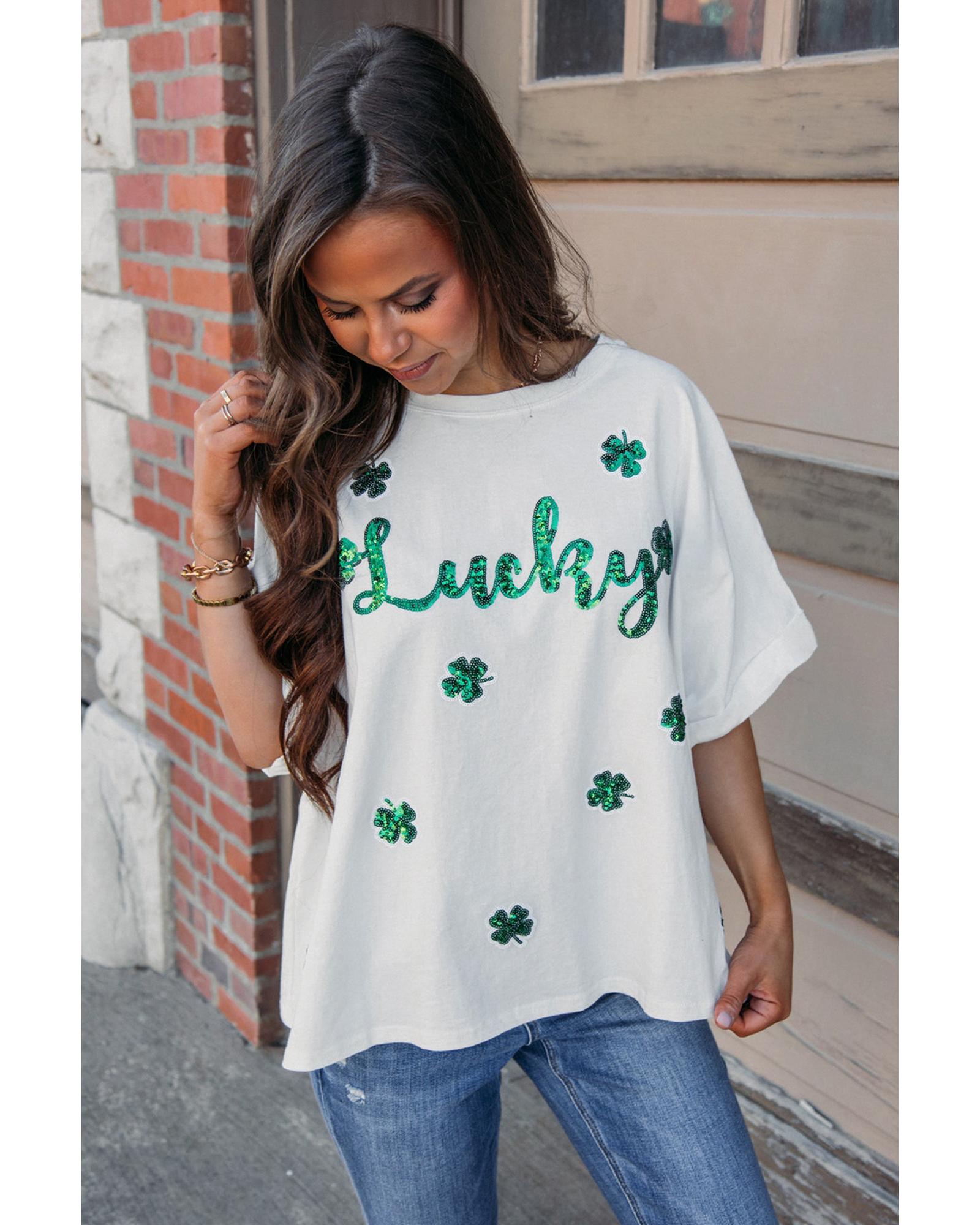 - White St Patrick Lucky Clover Sequin Graphic T Shirt
