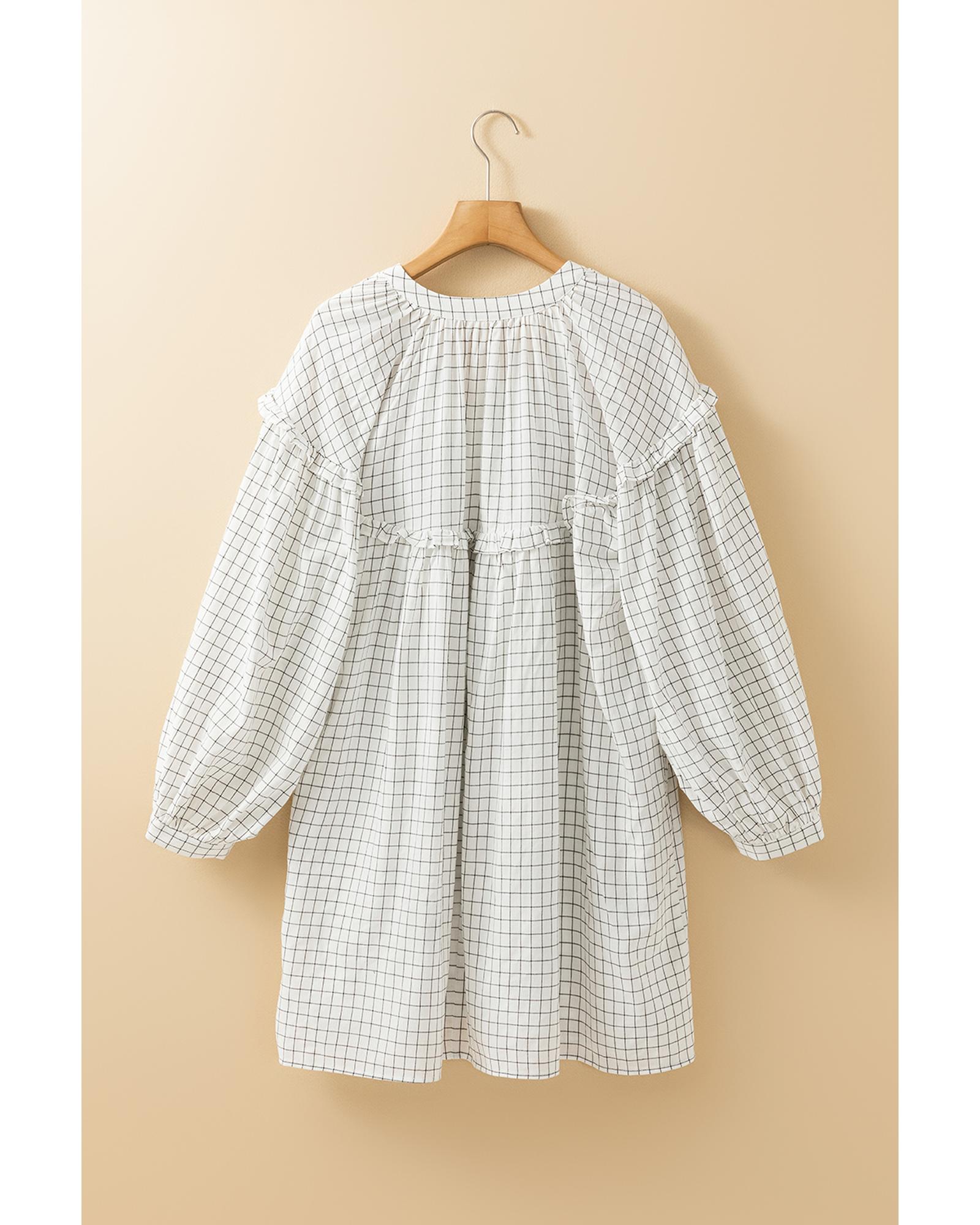 White Stripe Checkered Frilled V Neck Bracelet Sleeve Babydoll Dress – L