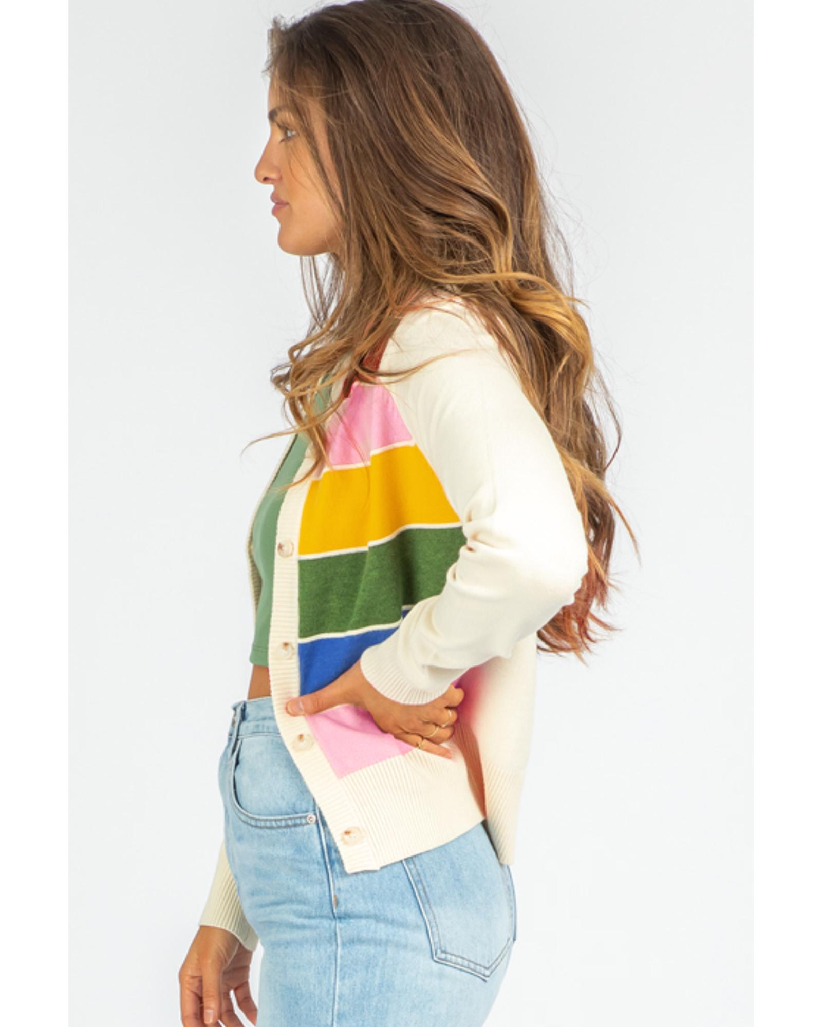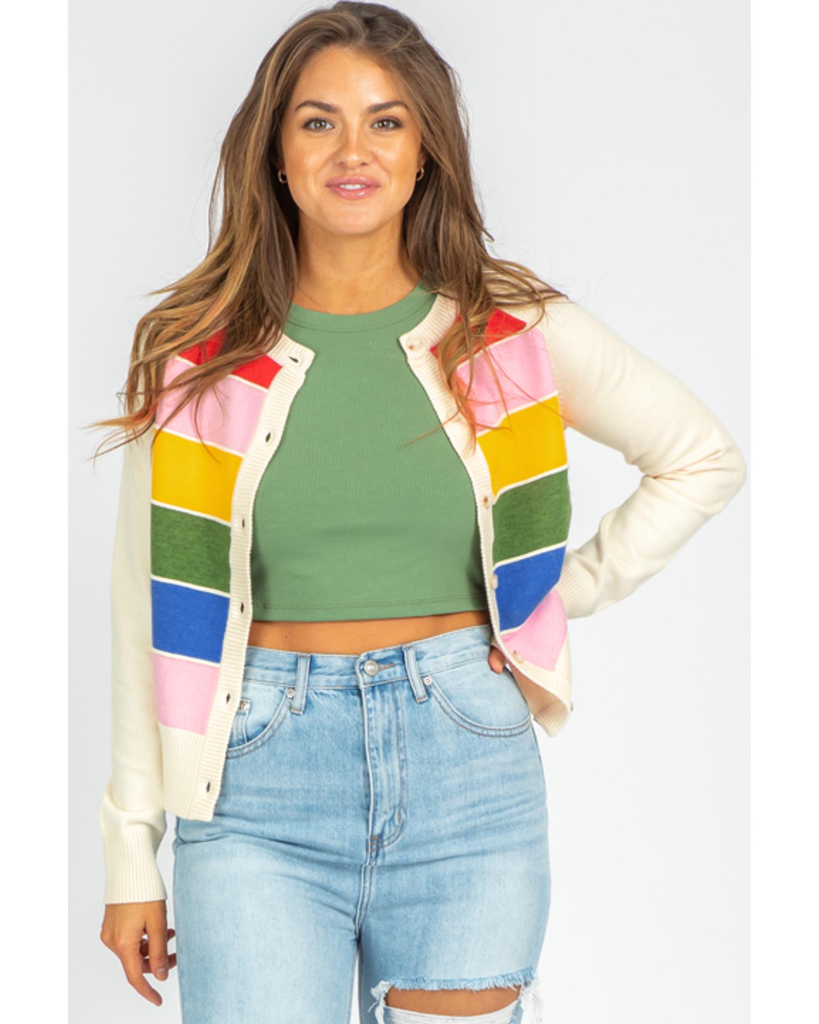 White Stripe Colorful Pattern Button Front Sweater Cardigan – L