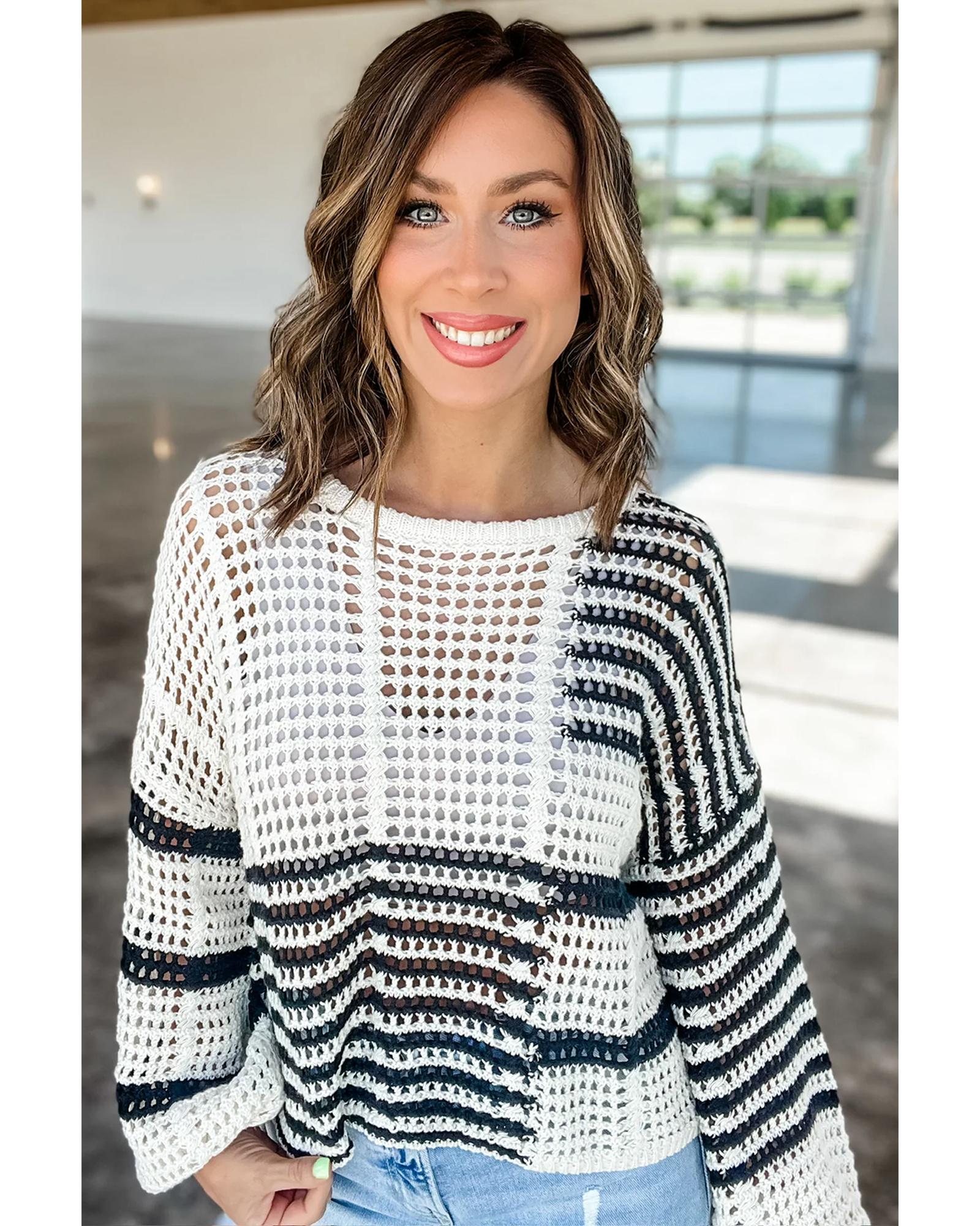 White Stripe Contrast Striped Crochet Puff Sleeve Sweater – L