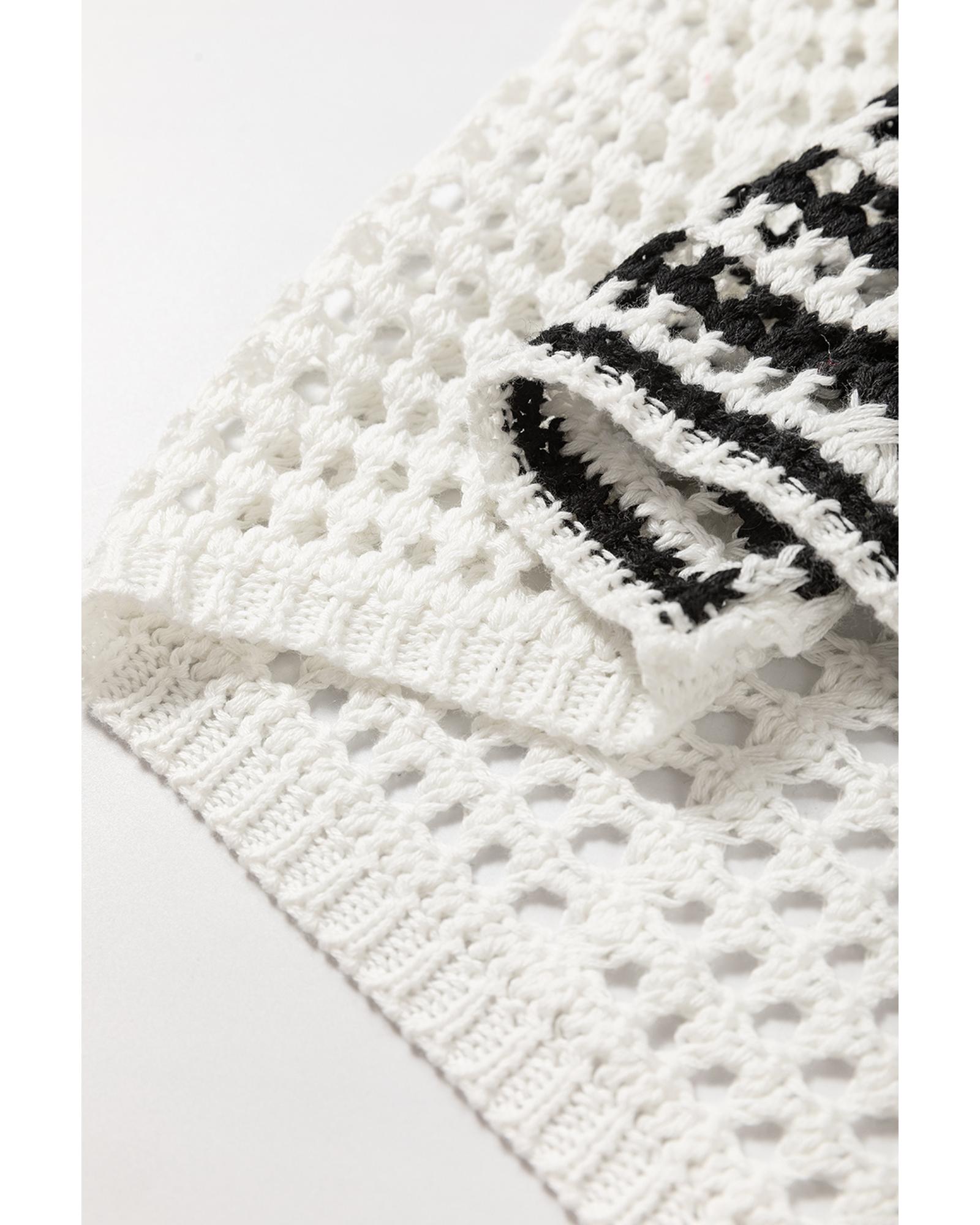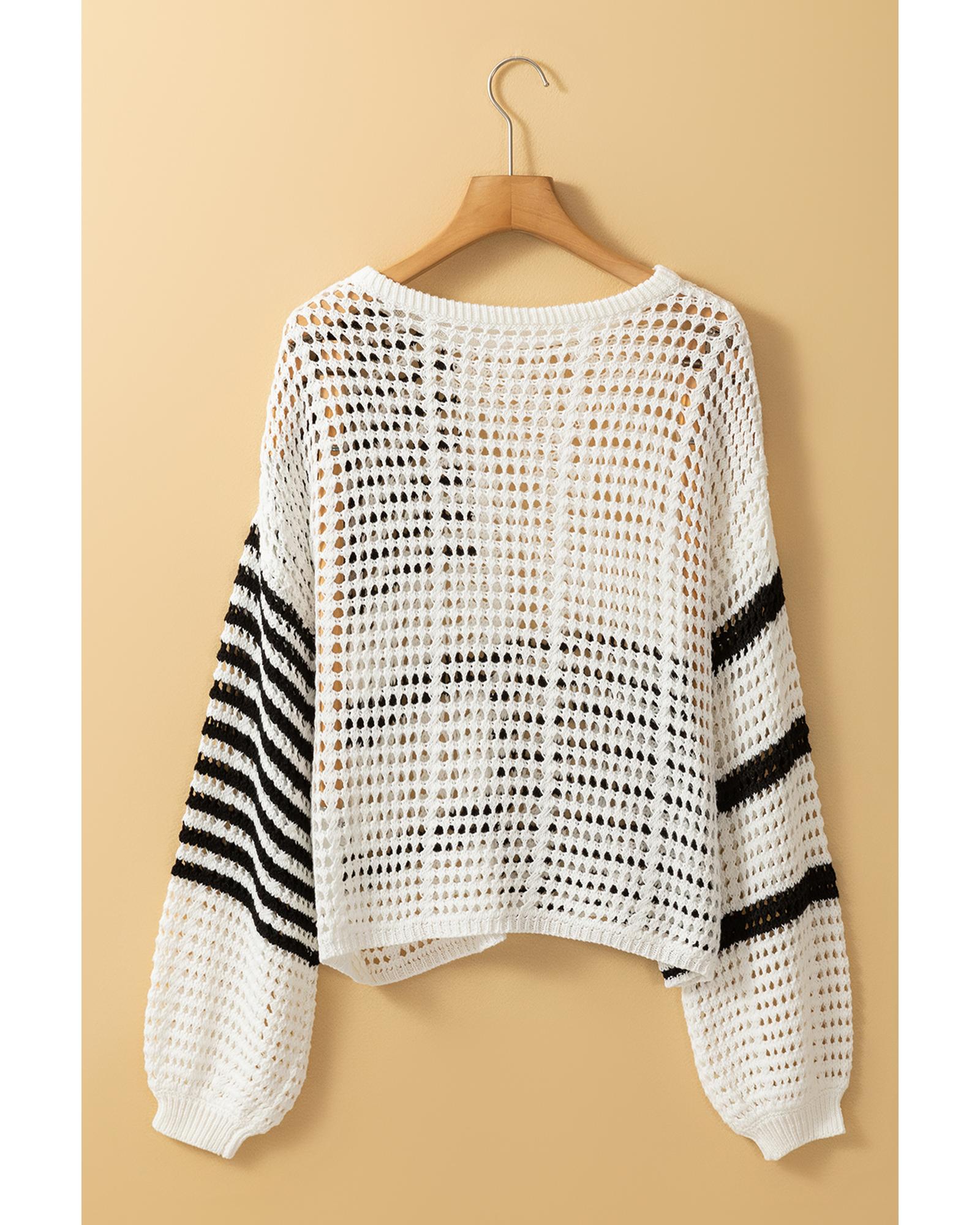 White Stripe Contrast Striped Crochet Puff Sleeve Sweater – S