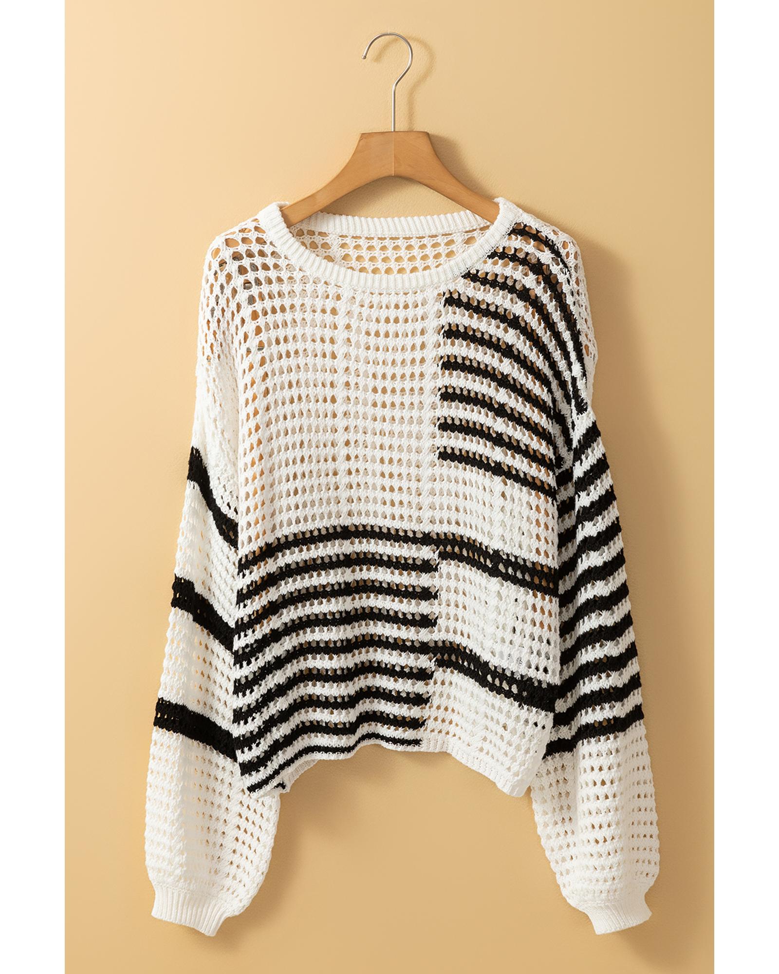 White Stripe Contrast Striped Crochet Puff Sleeve Sweater – XL