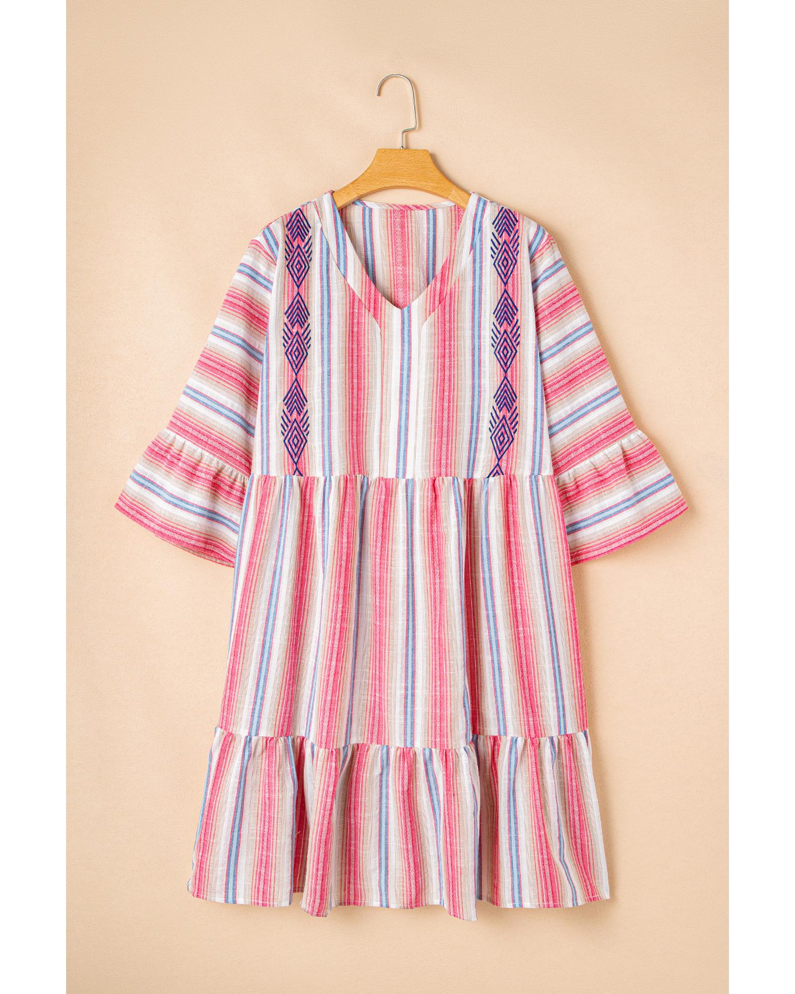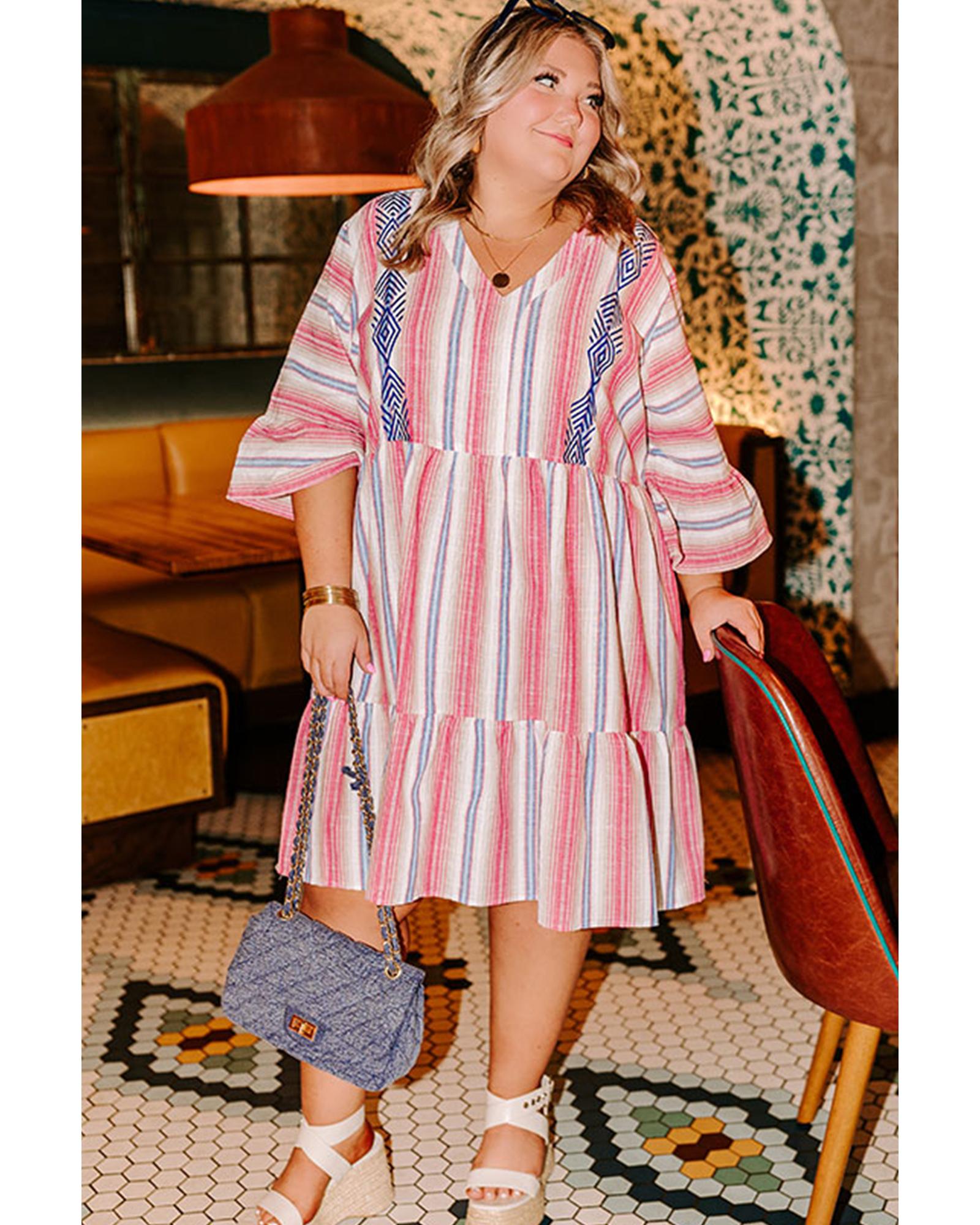 - White Stripe Plus Size Embroidered Detail Flared 3/4 Sleeve V Neck Dress