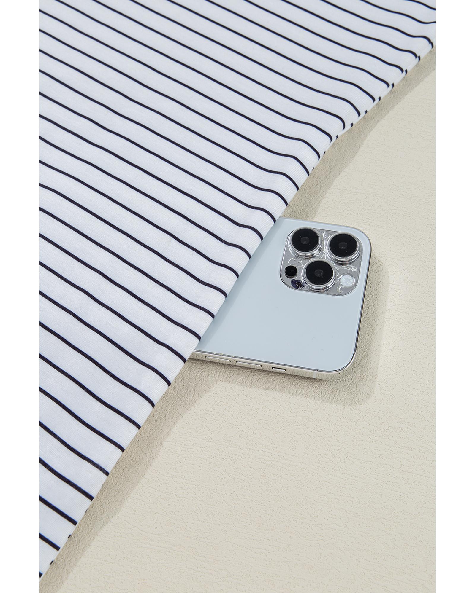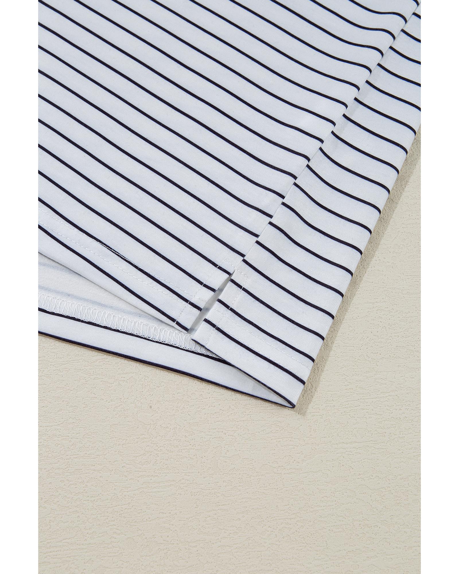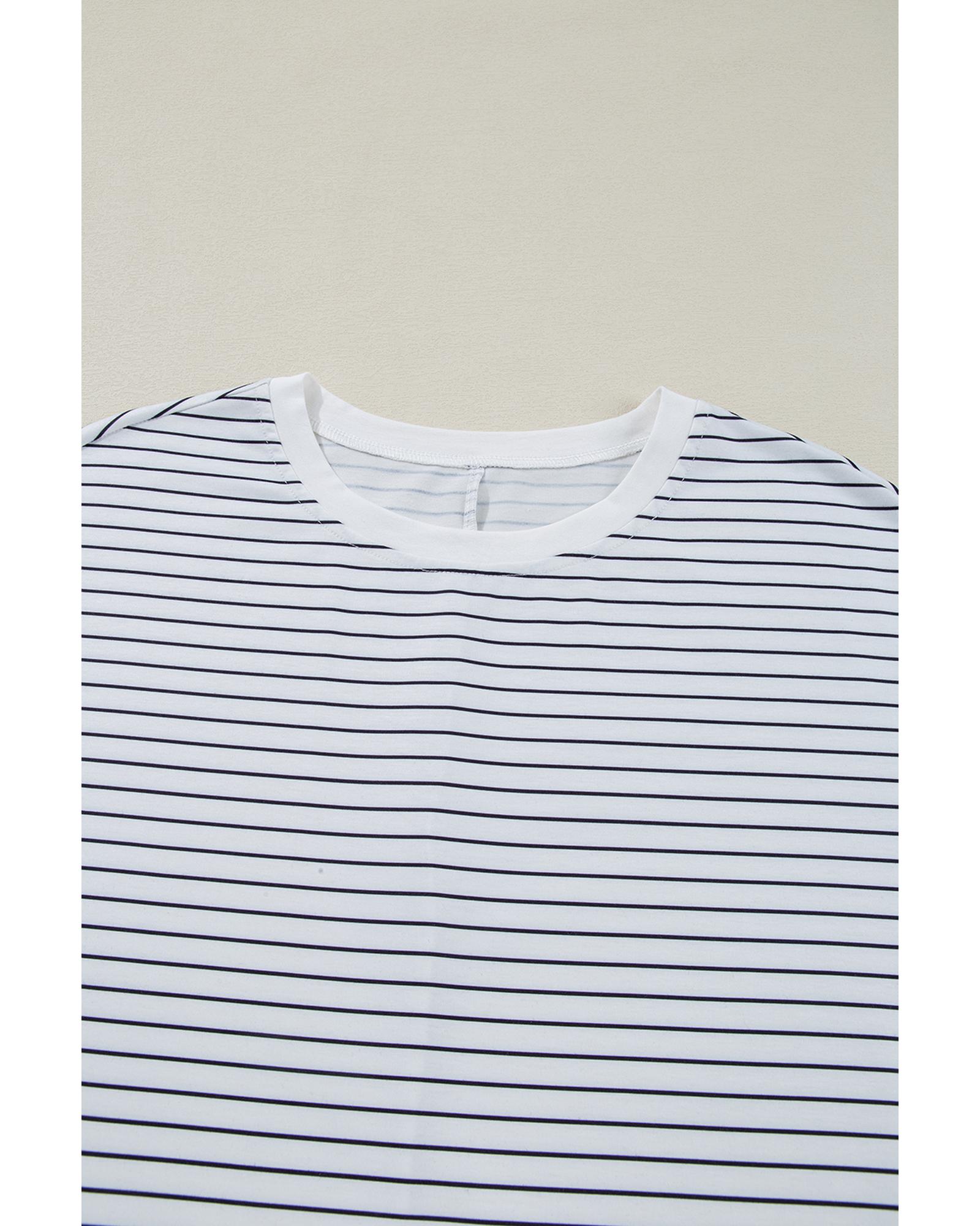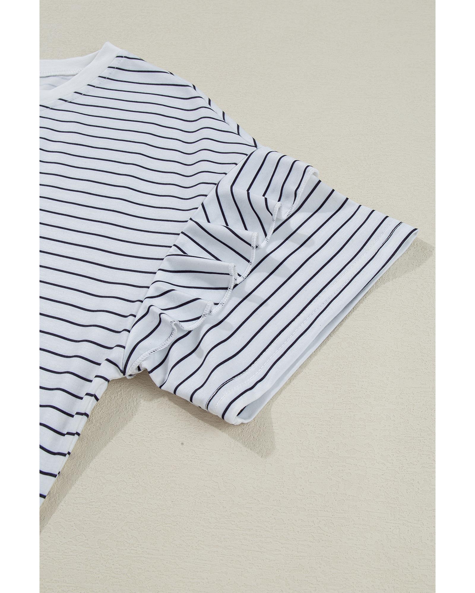 White Stripe Ruffled Short Sleeve Crew Neck T Shirt Shift Mini Dress – S