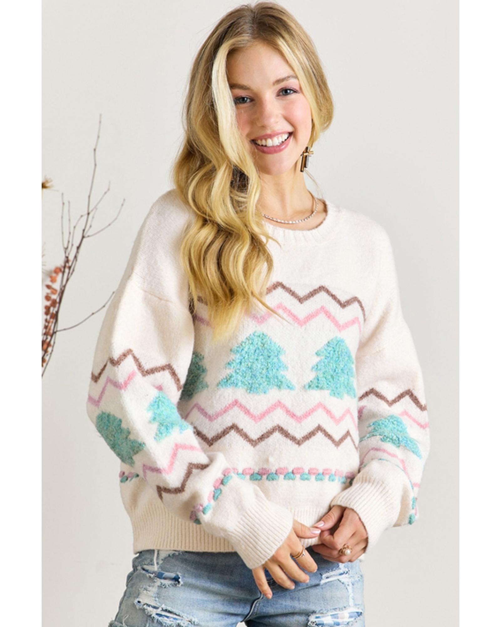 White Striped Christmas Tree Ribbed Trim Drop Shoulder Sweater – S